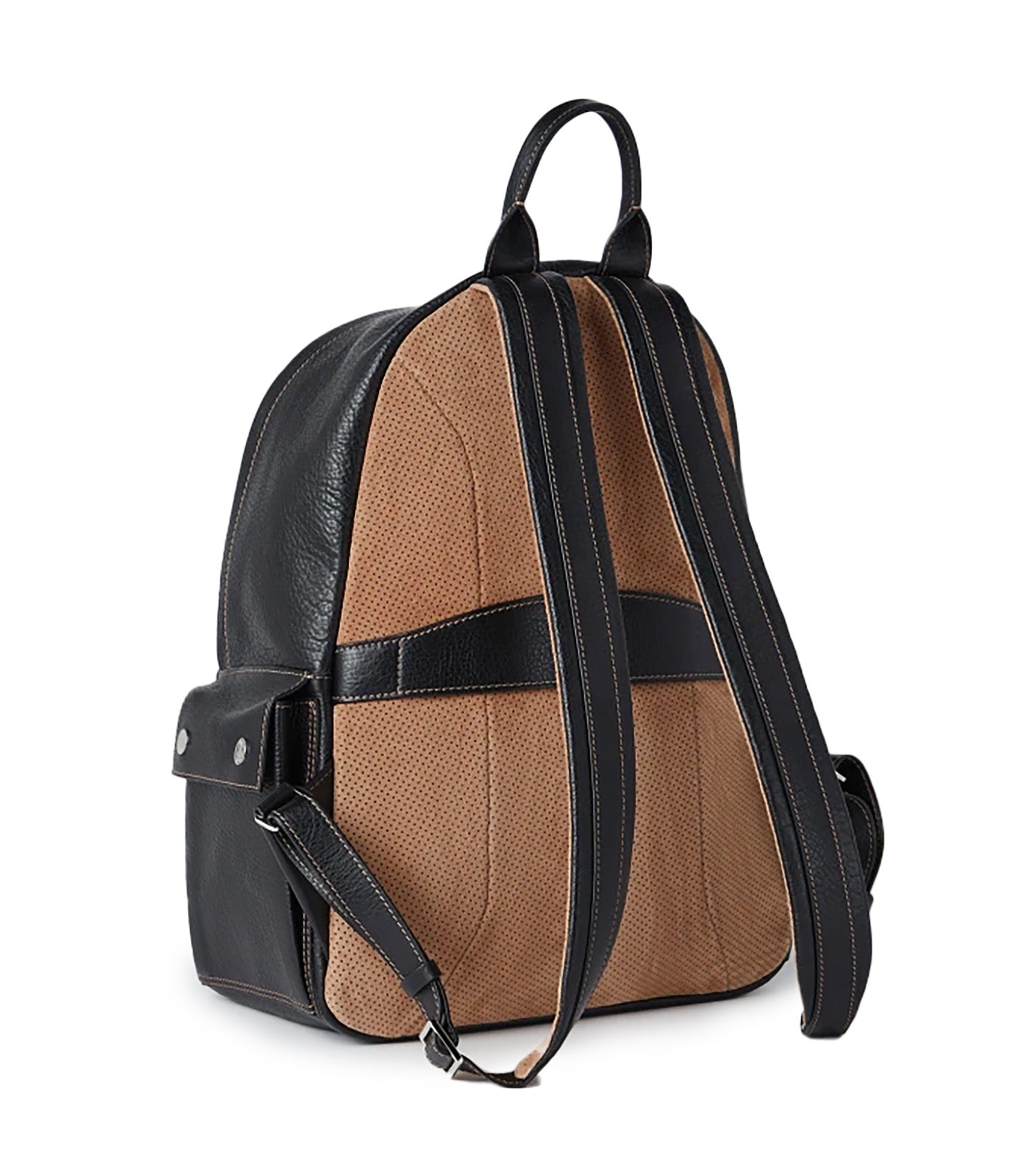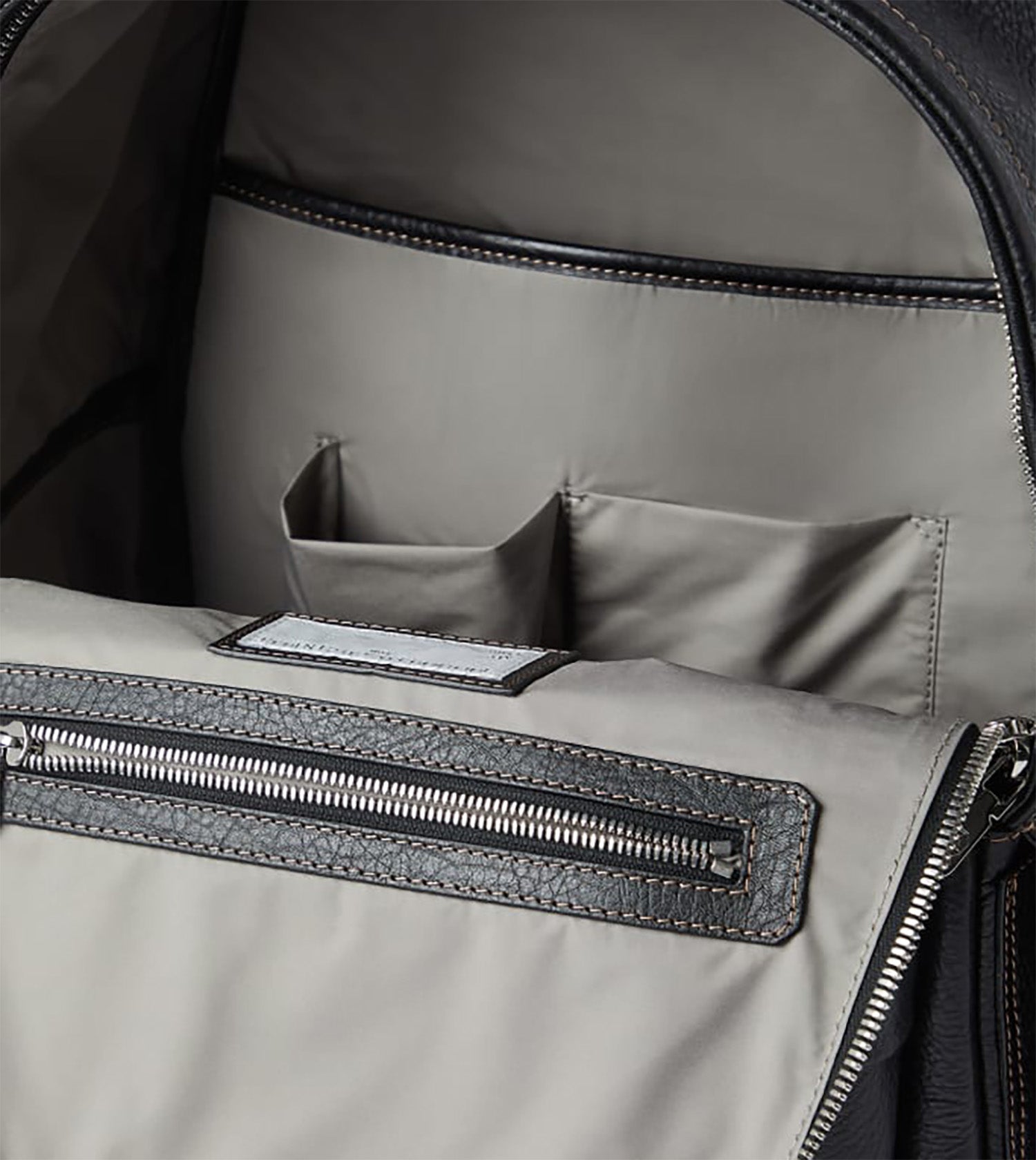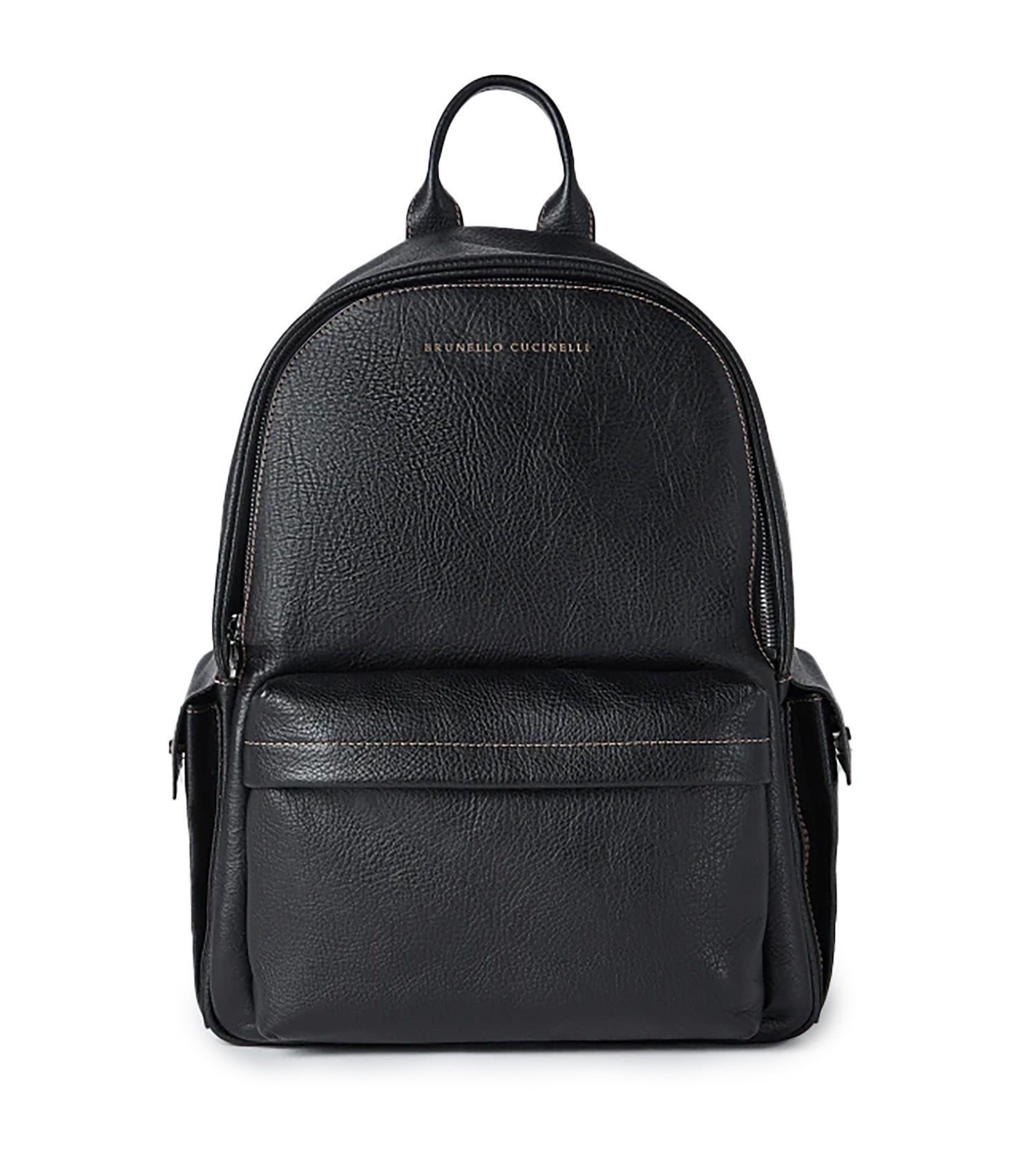 Brunello Cucinelli Leather Back Pack. Versatile for moving around the city as well as for travel, this backpack combines functional design and refined materials. On the exterior, two small magnetic closure side pockets and a front zipper pocket ensure essential items are always at your fingertips. A strap on the back allows the bag to be attached to a trolley for easy transport.
