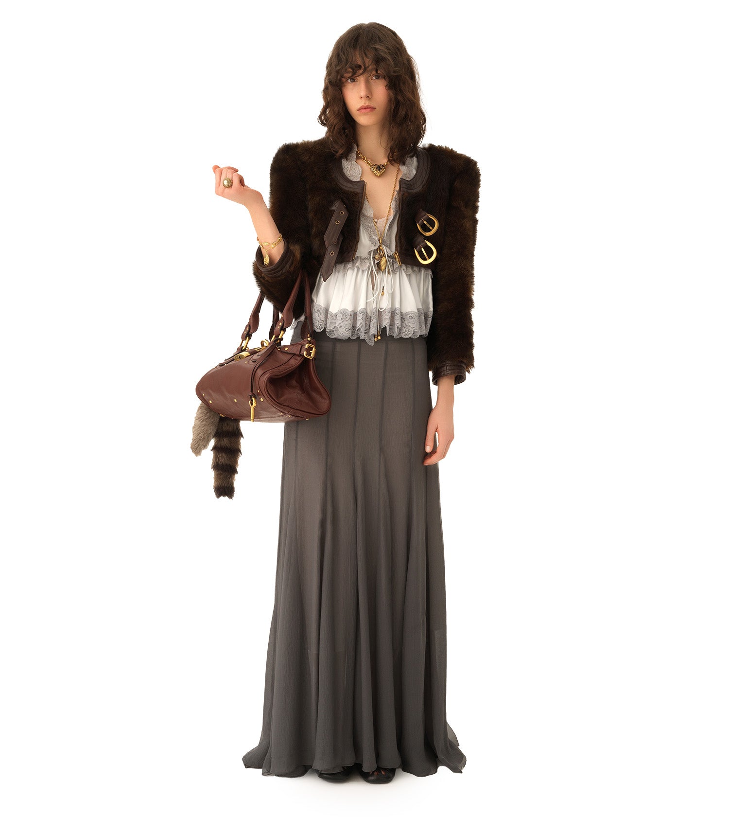 Chloe Lambskin Shearling Leather Jacket. Scoop-neck cropped Spencer jacket in Toscana lambskin with smooth leather trim and buckled tabs.