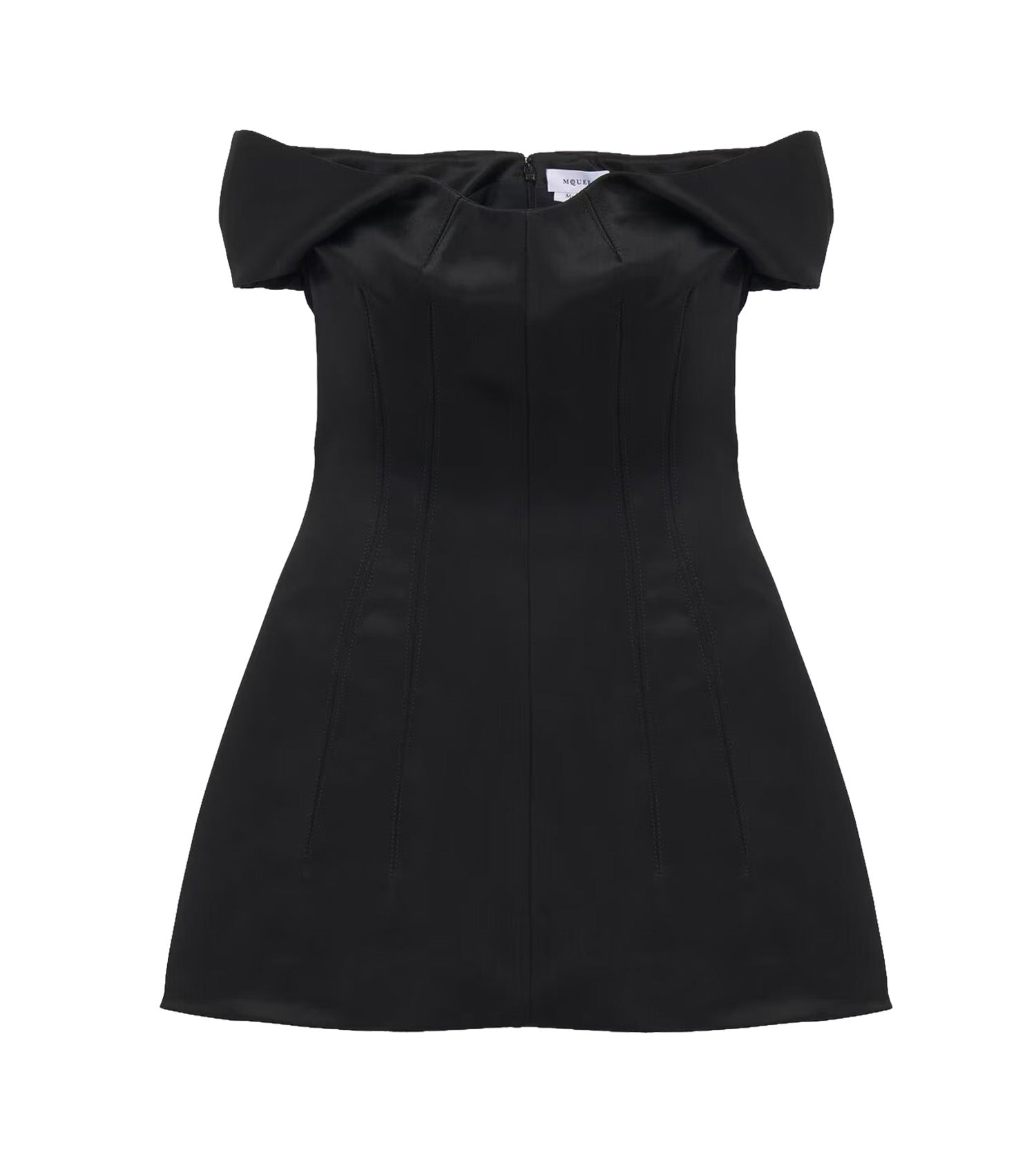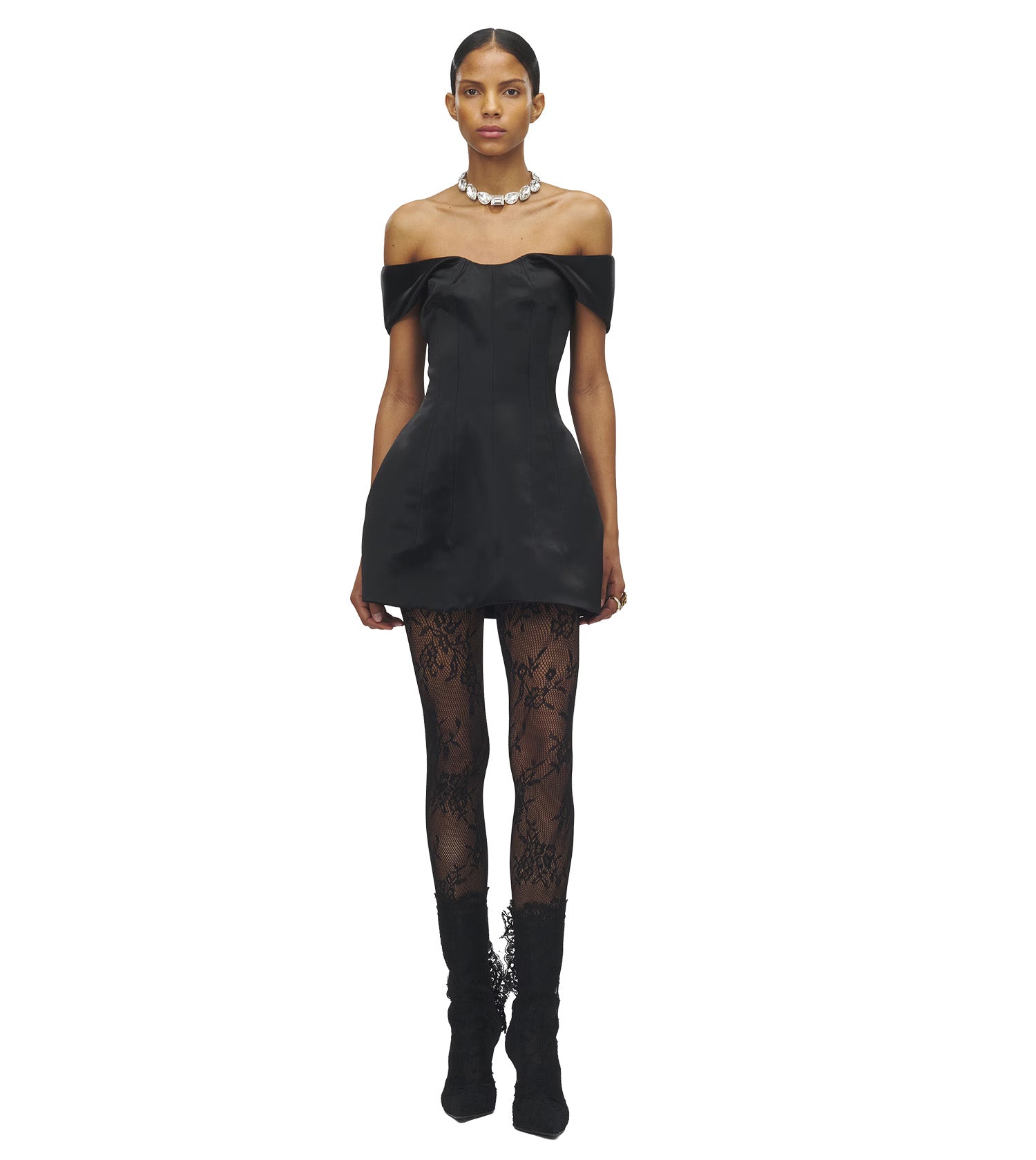 McQueen Mini Dress in Black. Mini dress in black bonded satin. Scoop neck, sculpted hips and vertical seam detailing. Finished with a back zip fastening.