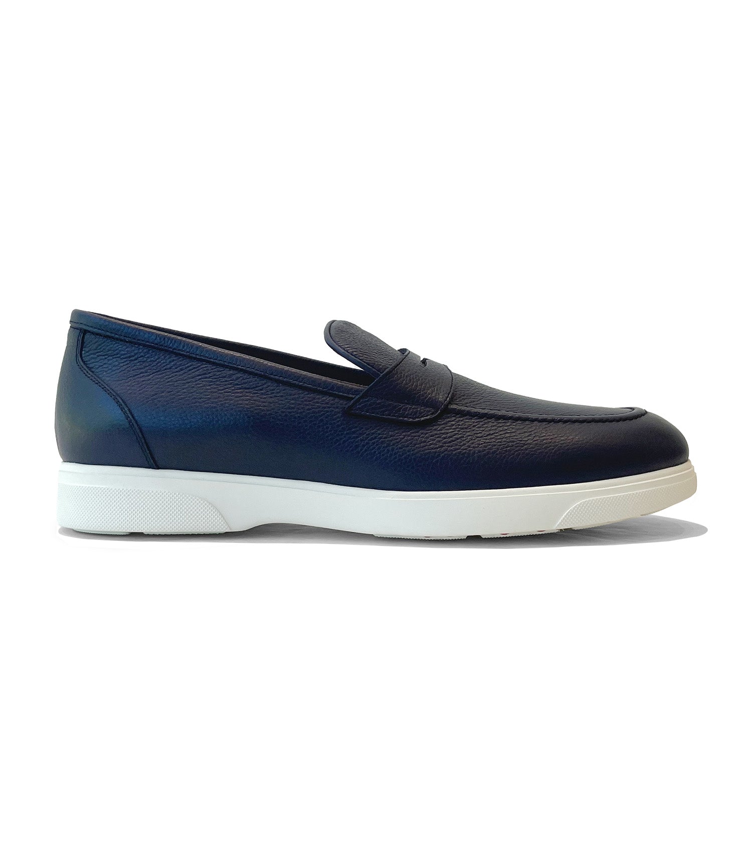 This loafer is done in a pebbled leather and white rubber contrast sole. Made in Italy.