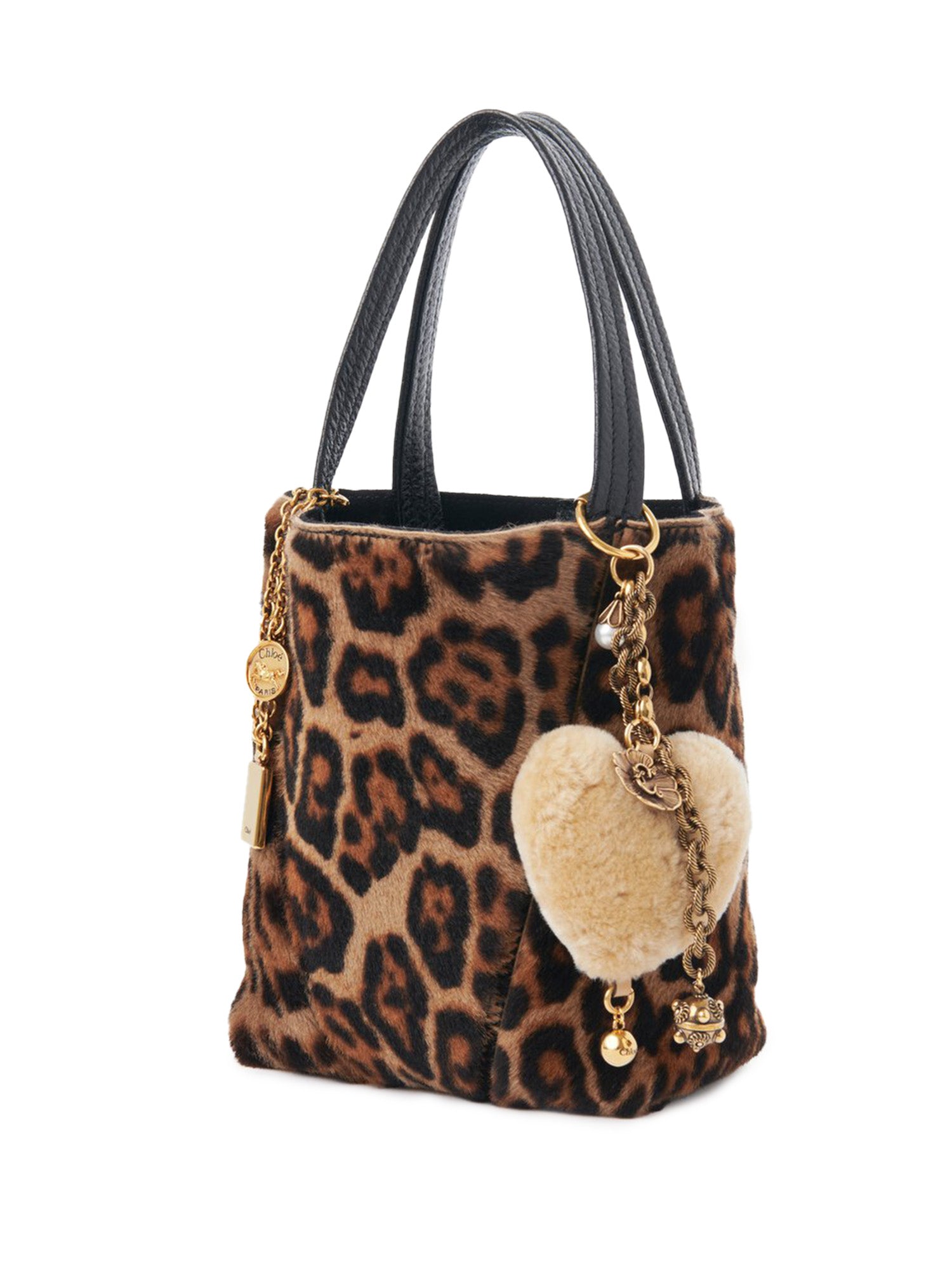 This Chloé Symbols bag charm features a large shearling heart, paired with textured chains and gold-tone brass pendants. An engraved Chloé logo and a "C" motif complete this accessory.