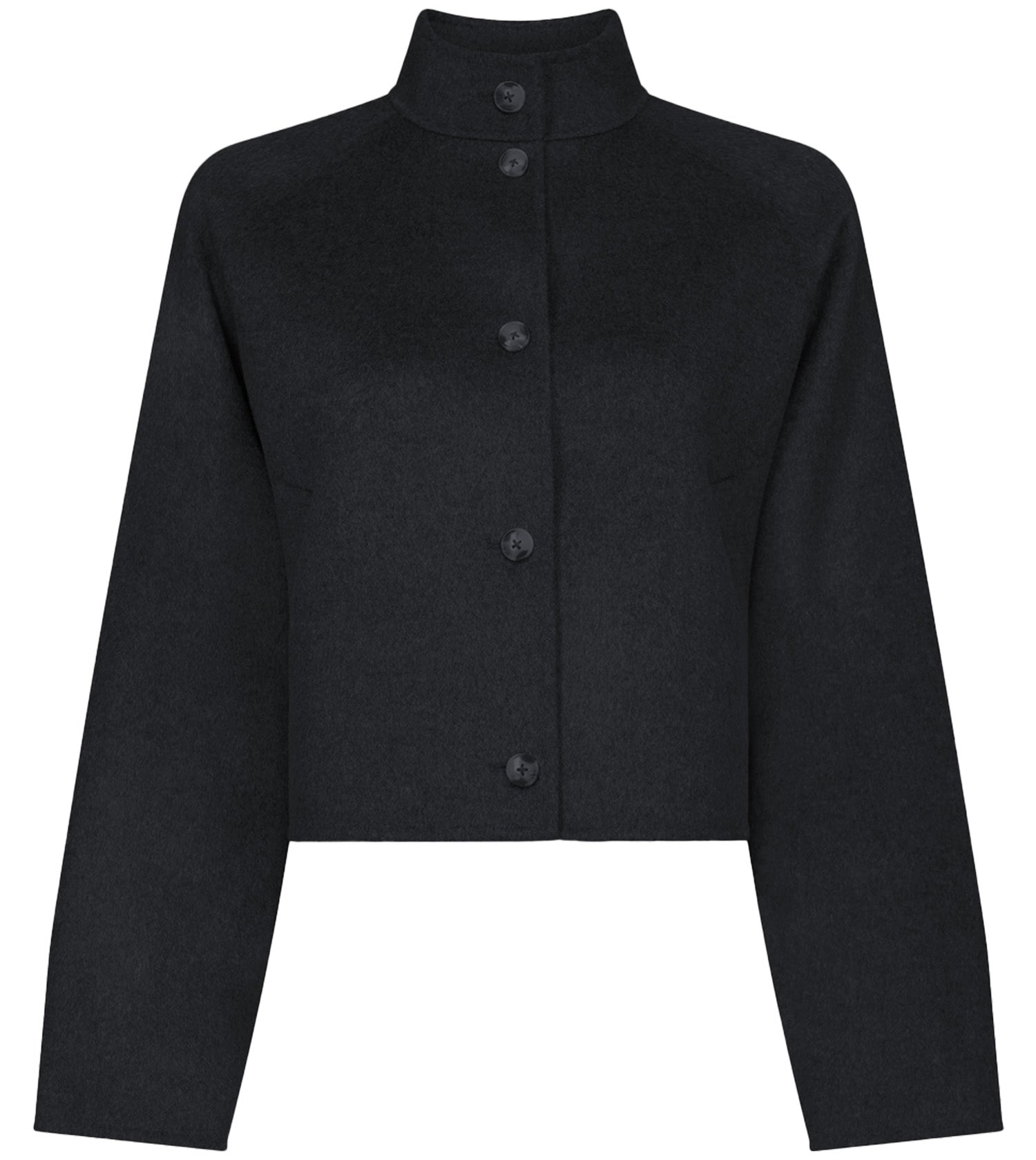 Loulou Studio Nyma Wide Armhole Short Jacket. This jacket is made of wool cashmere drap. It features a straight, slightly cropped fit complete with a stand collar and raglan sleeves, creating a graphic silhouette that will effortlessly take you from autumn to winter.