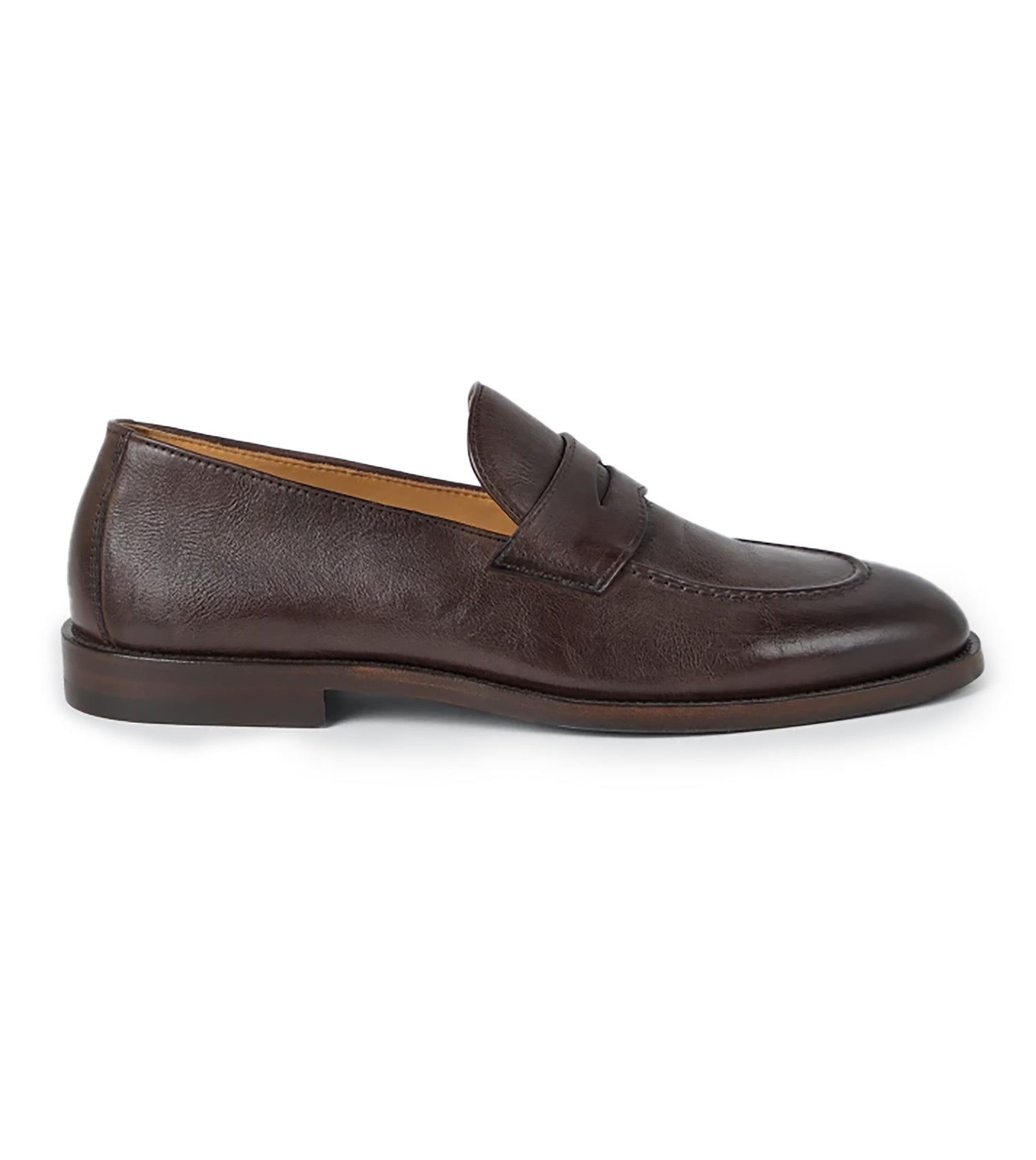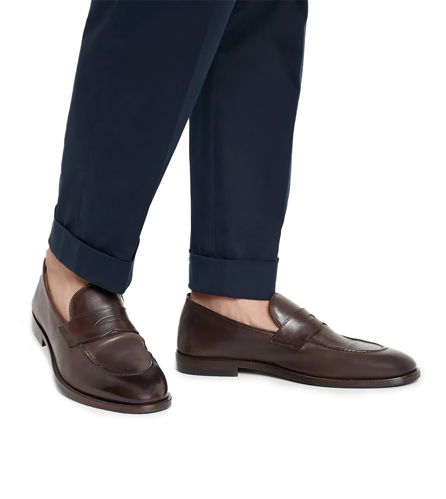 Brunello Cucinelli Leather Loafer. Refined Brunello Cucinelli materials enrich the style of these calfskin Penny Loafers. Bold and semi-polished, the leather’s elegant appearance is paired with the light, classic silhouette and the thin leather bottom.