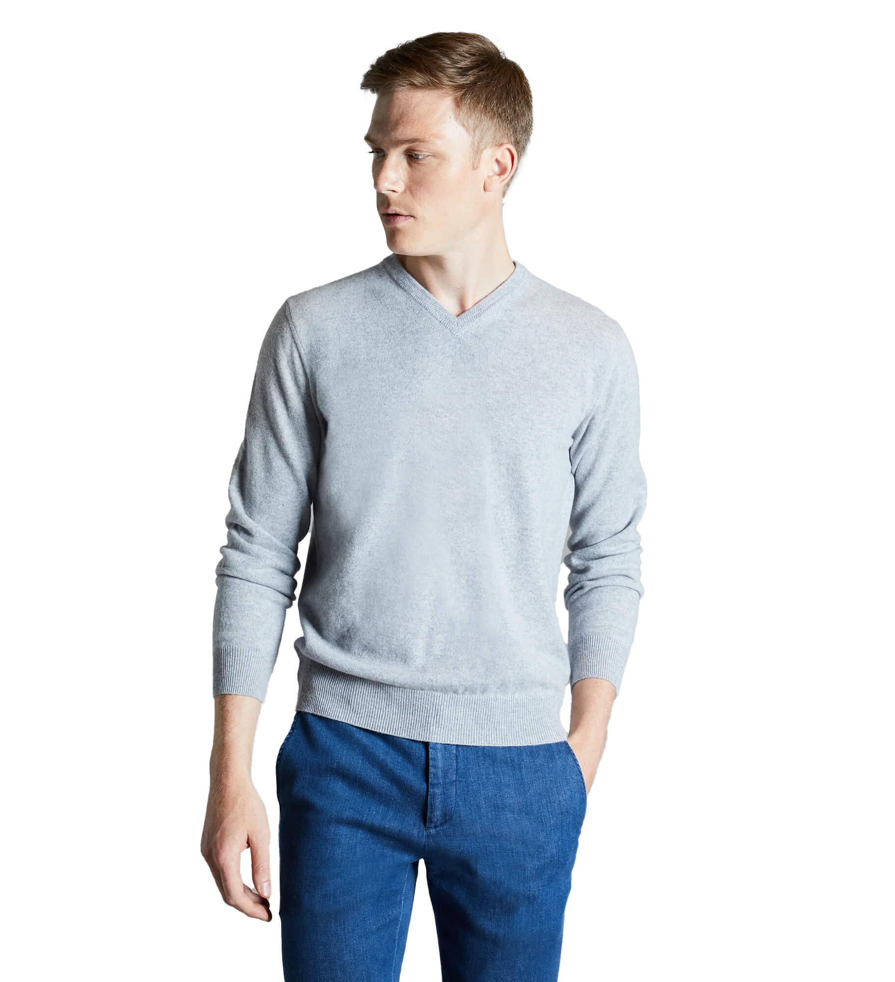 Colombo Kid Cashmere V Neck. This Men's sweater is crafted from plain knitted Kid Cashmere, an extremely fine and soft fibre, obtained exclusively from the undercoat of the Hircus goat kids. Its precious and exclusive yarn makes this garment the luxury version of an essential knitwear item.