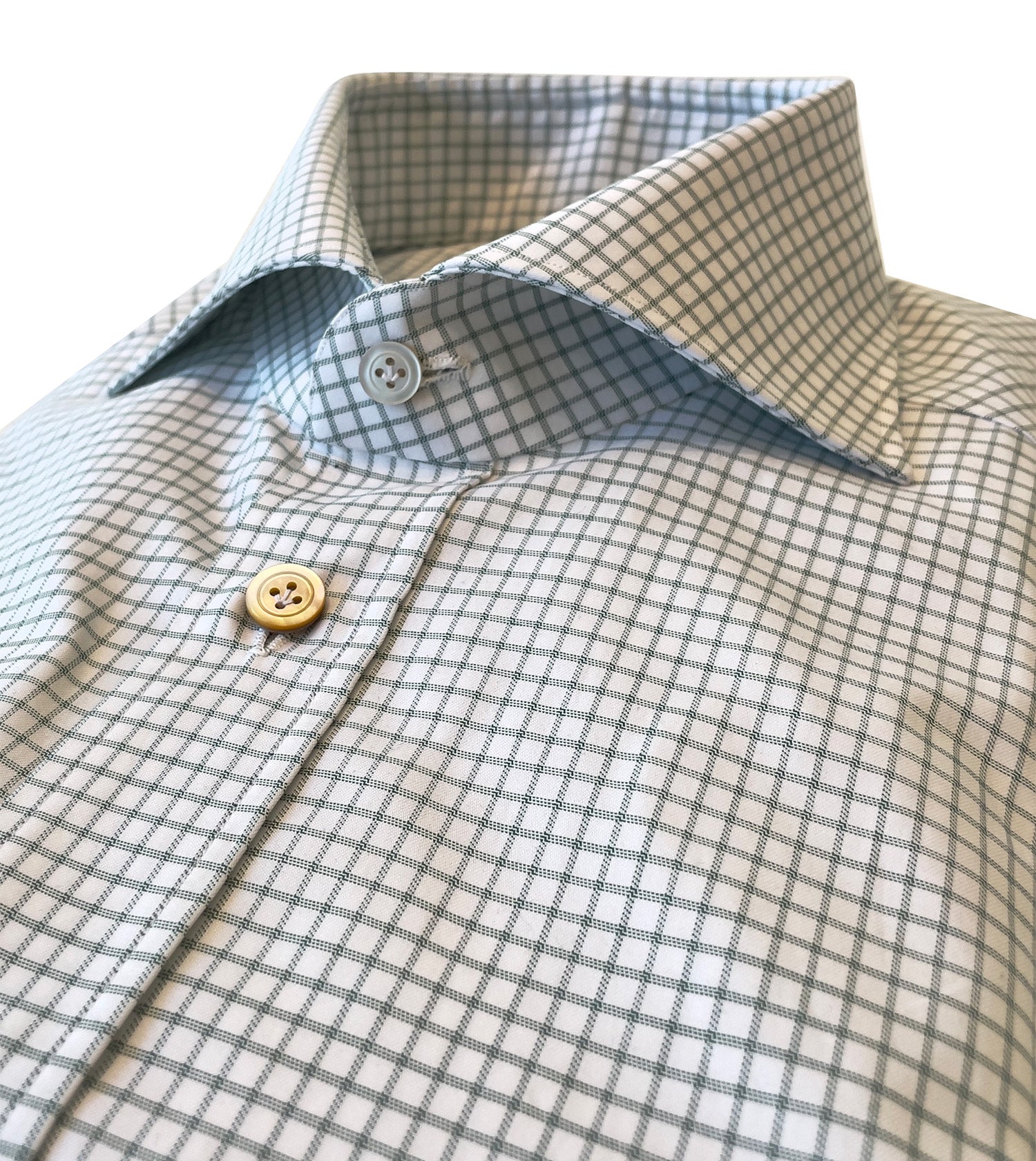 This Kiton green micro check shirt is done with a white ground and green micro check.