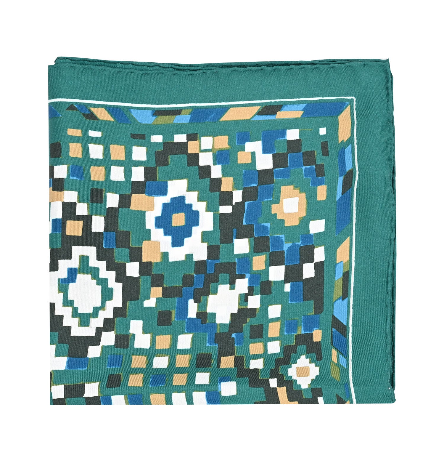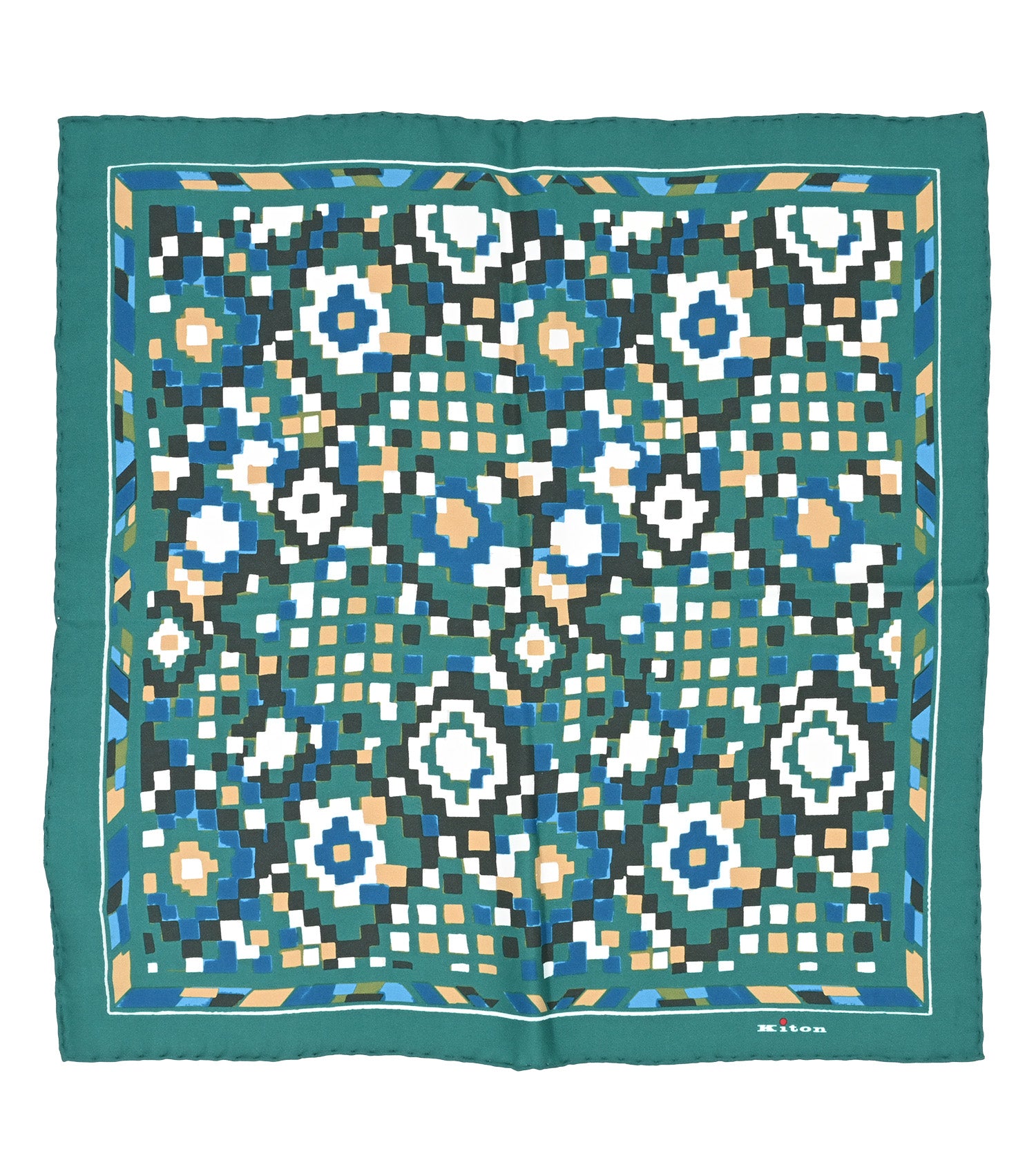 Kiton Silk Green with White and Tan Geo Pattern Pocket Square.