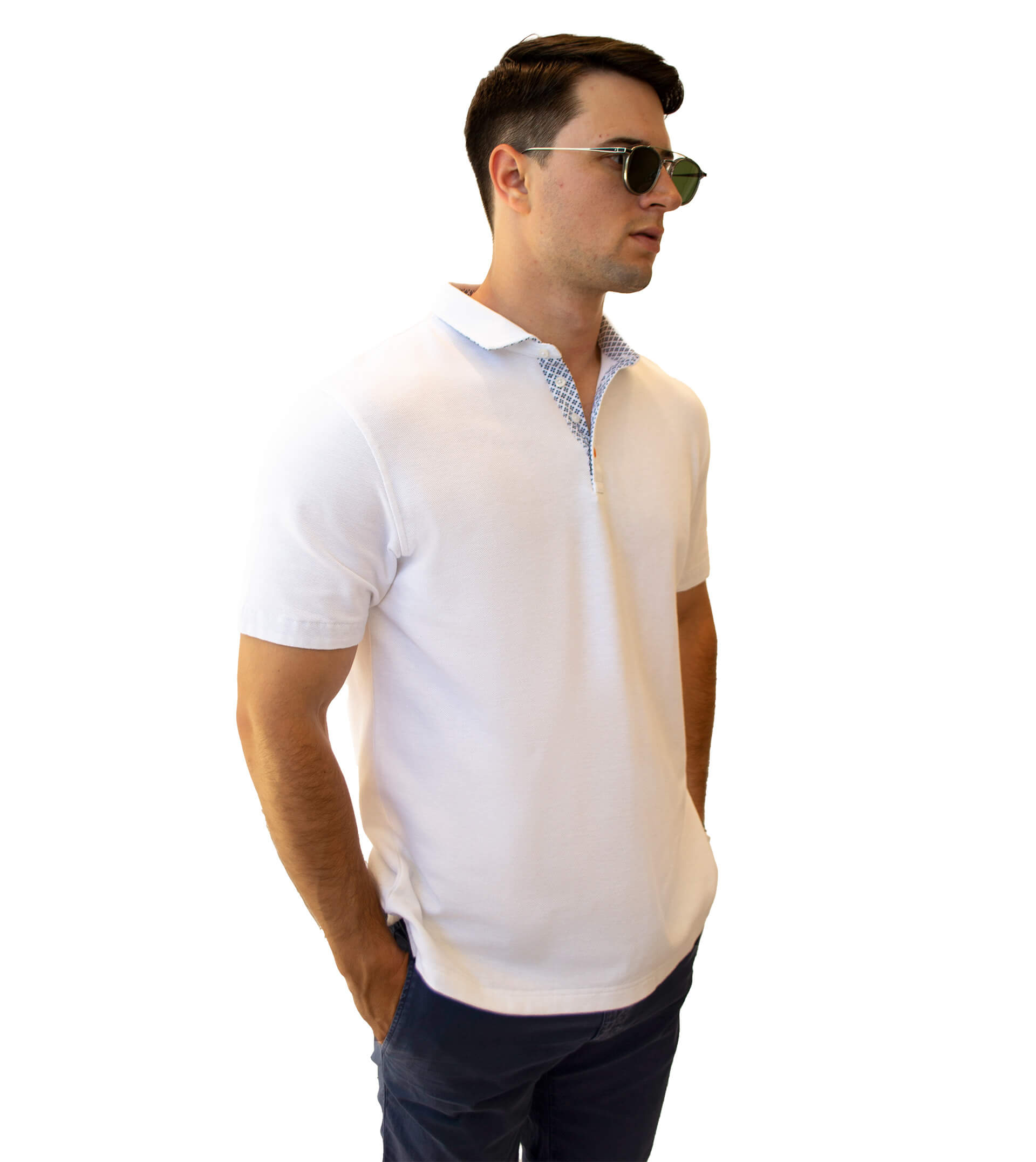 Cotton Comfort Pique short sleeve polo with accenting and sunglass loop. Less than 1% shrinkage.