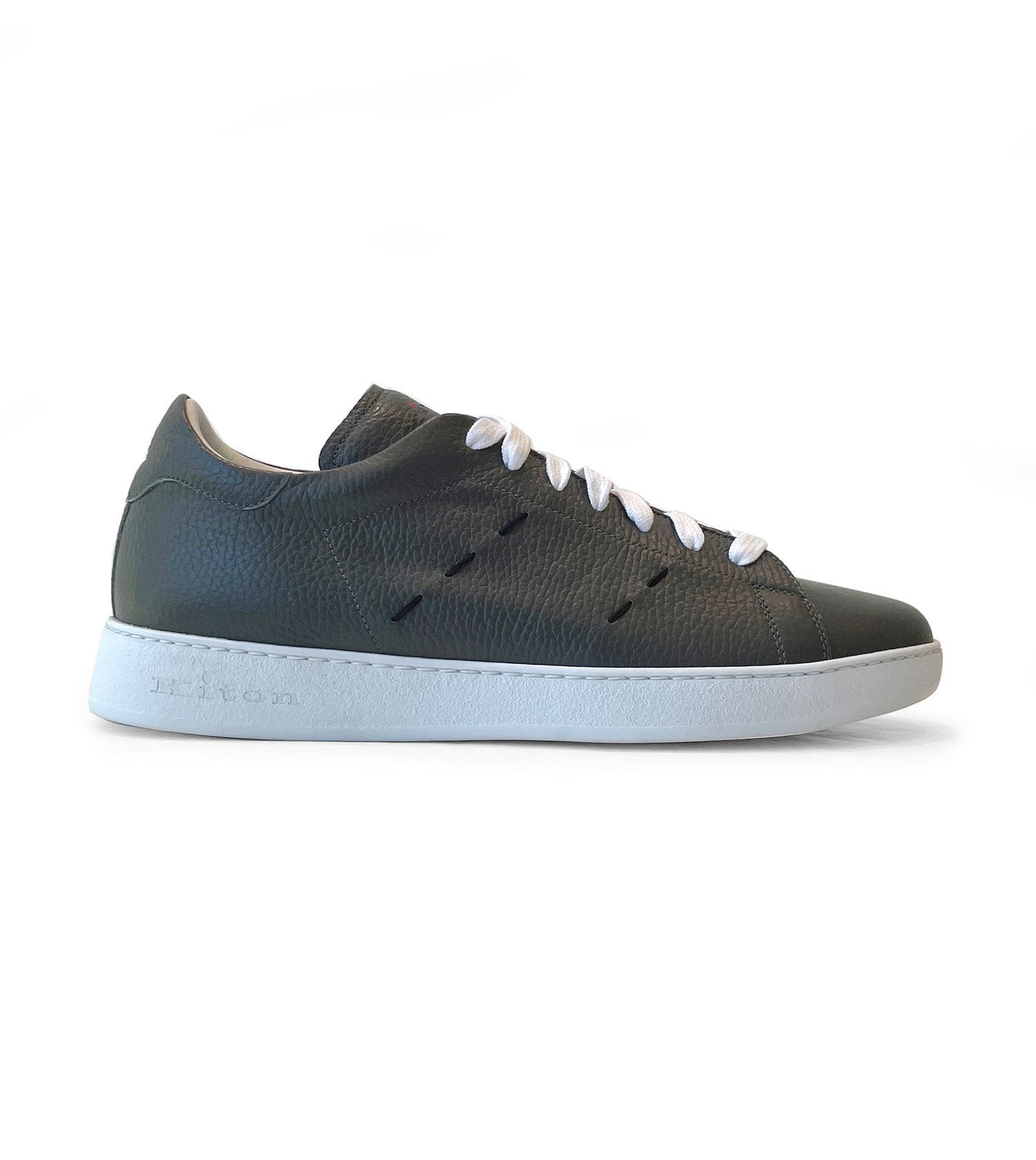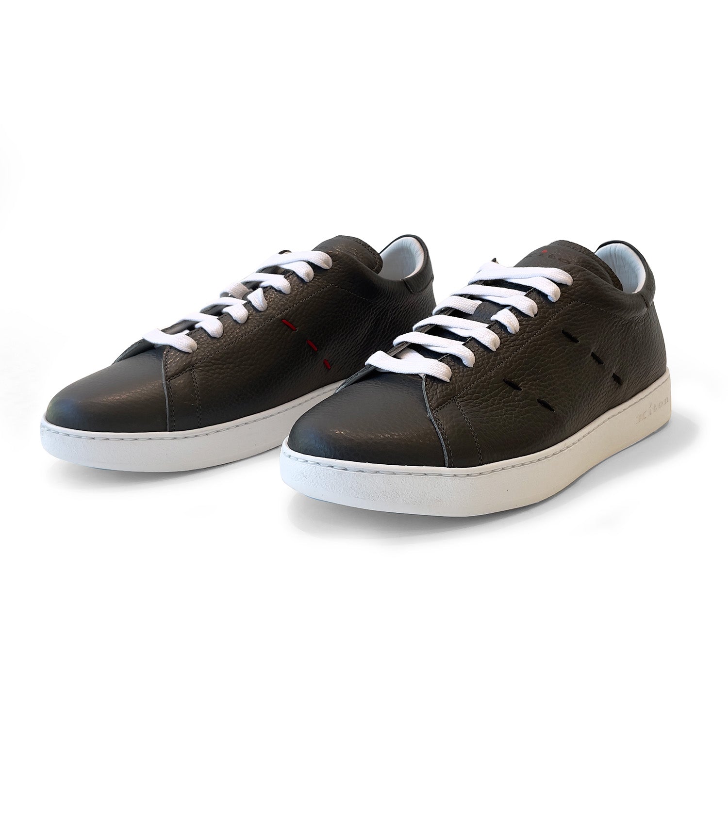 Kiton pebbled leather sneaker, in Charcoal. Bold stitching on sides and red accents elevates your everyday sneaker choice. Made-in-Italy.