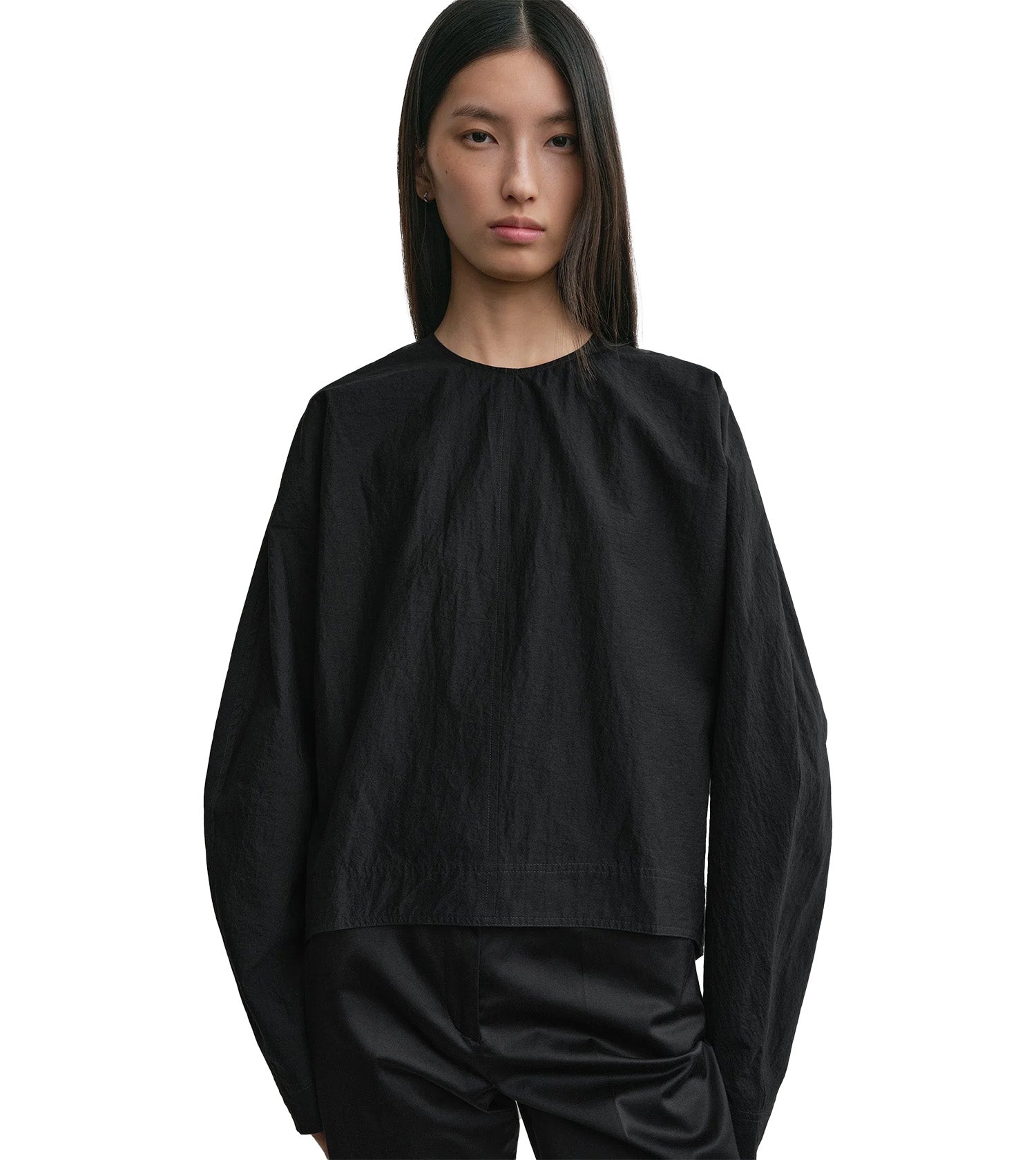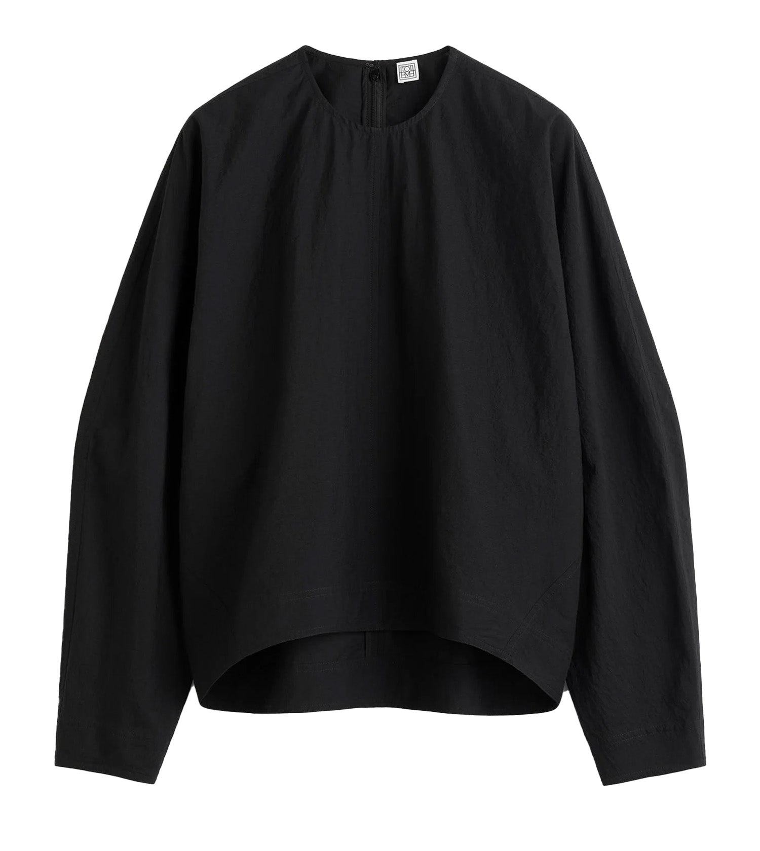 Toteme Batwing Top. TOTEME top cut to an architectural shape with ample batwing sleeves and a slightly tapered waist with signature twisted sleeves. It is crafted from a light, crisp and crinkled organic-cotton fabric and fastens with a concealed back zipper.