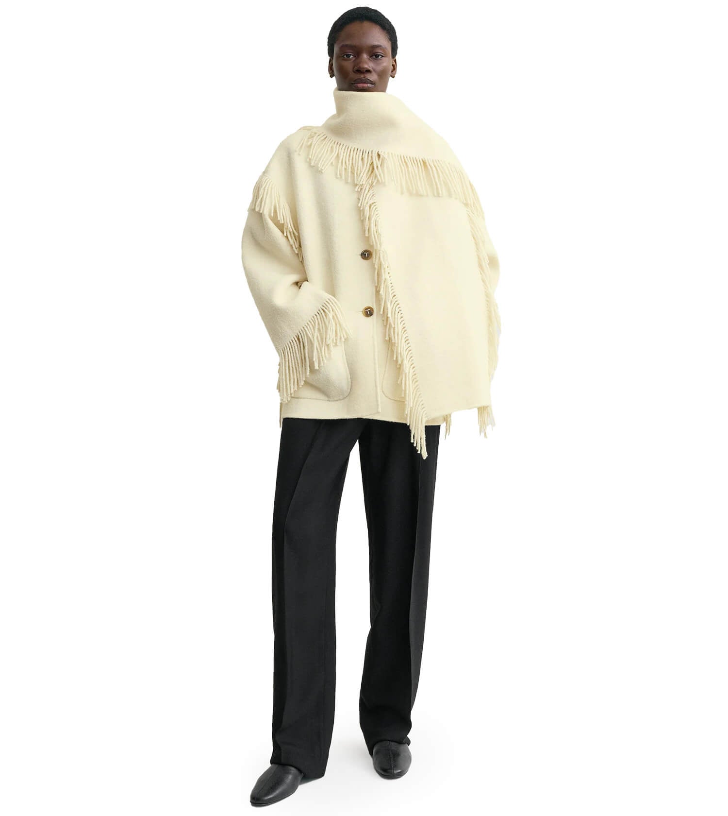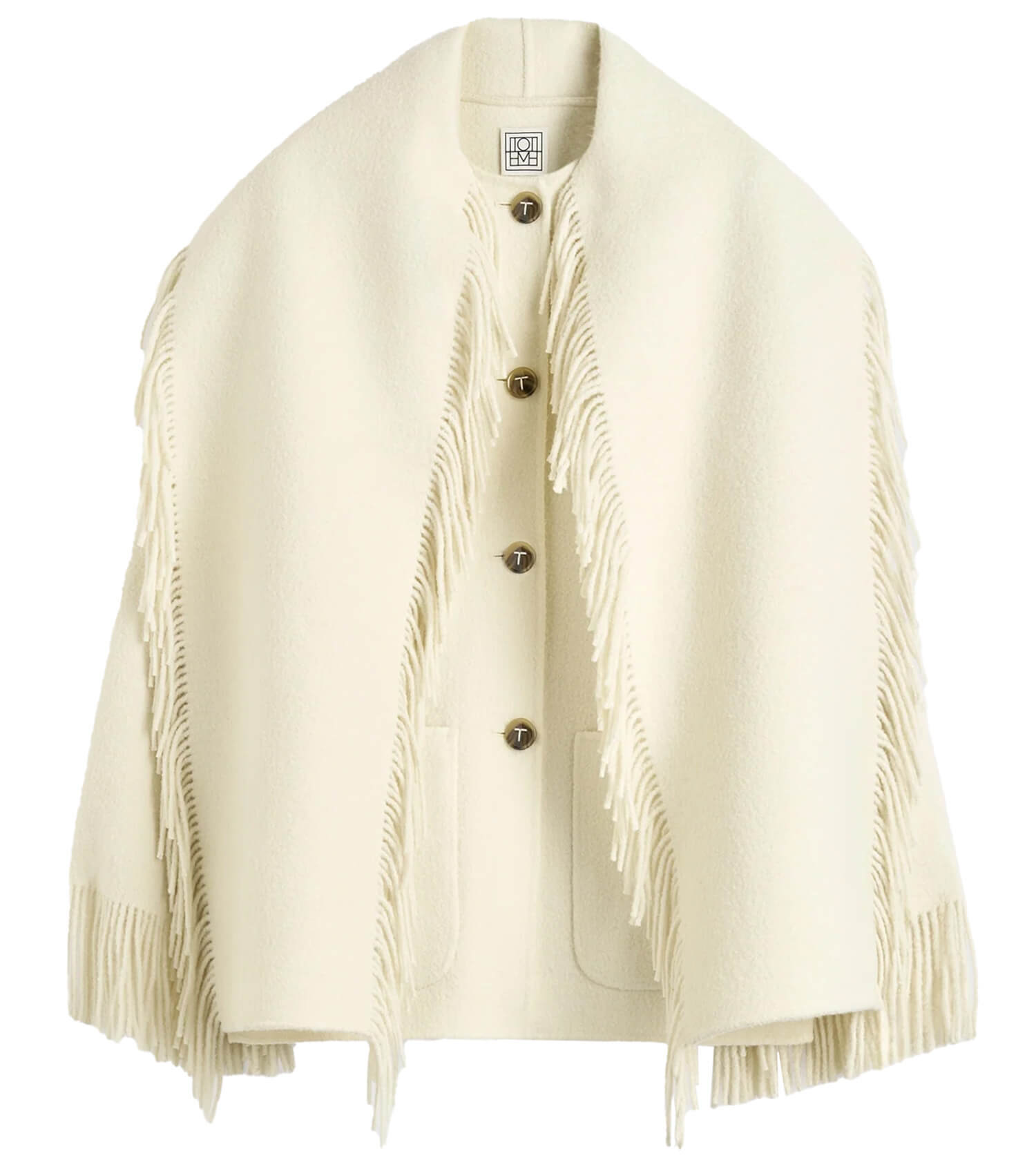 Toteme Fringed Scarf Jacket. Signature TOTÊME scarf jacket reimagined for the season with all-around fringe. It is made from wool-blend bouclé to an oversized, boxy silhouette set with ample patch pockets.
