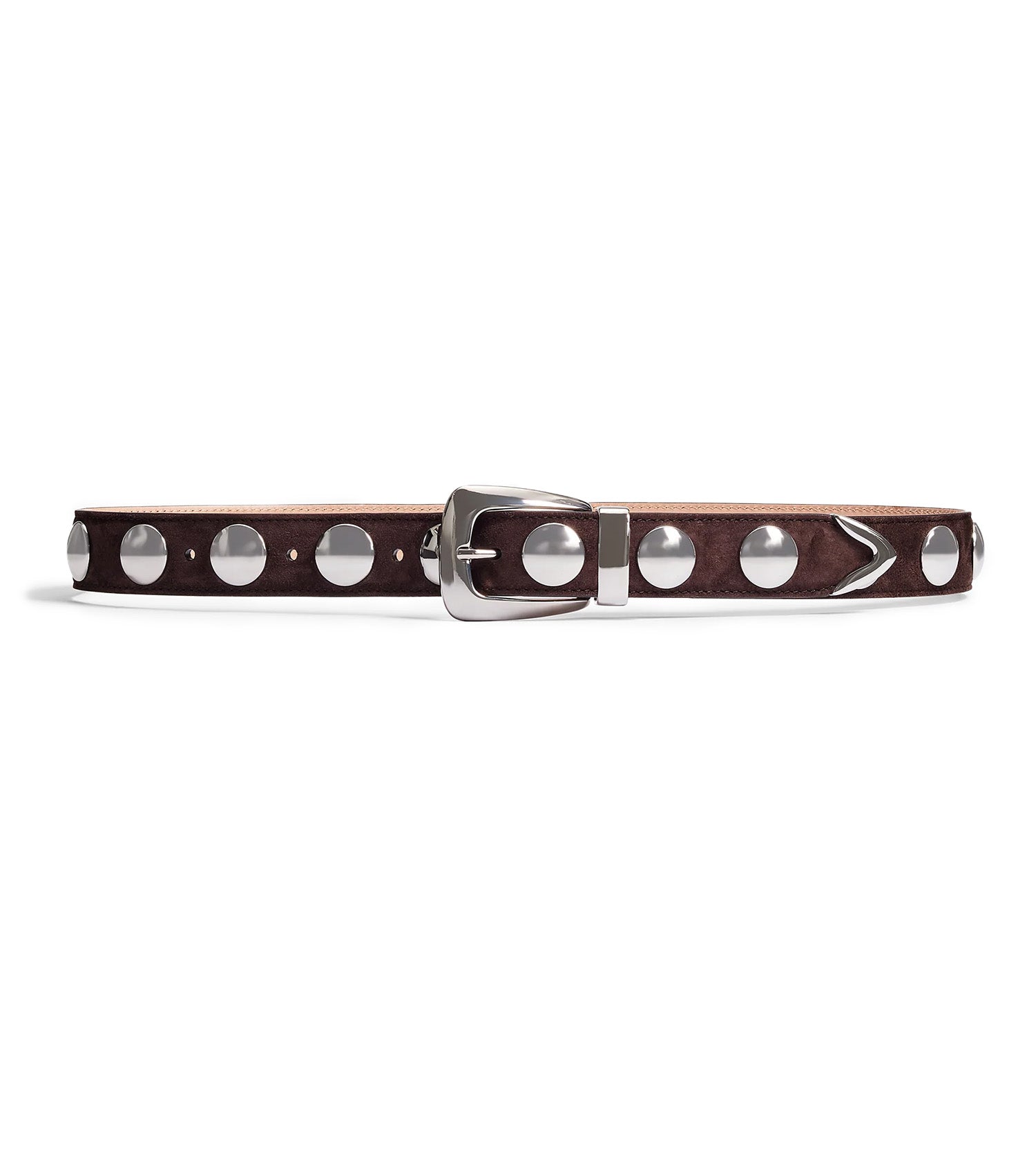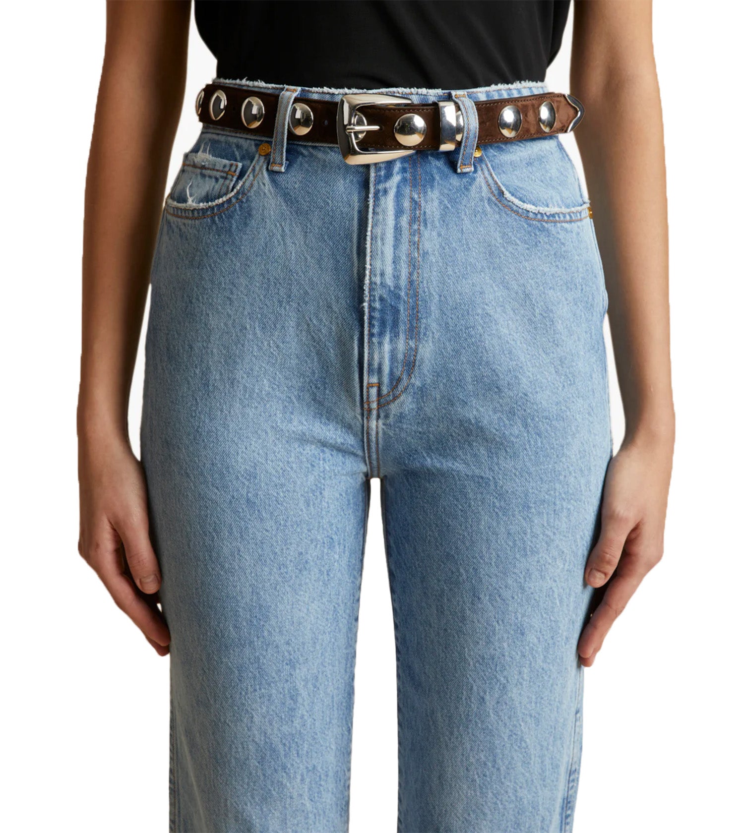 Khaite Benny Belt With Studs-Silver Buckle (30MM). A refined and versatile belt made memorable by jewelry-like hardware—a boldly formed buckle, loop, and tip—in palladium-plated brass.