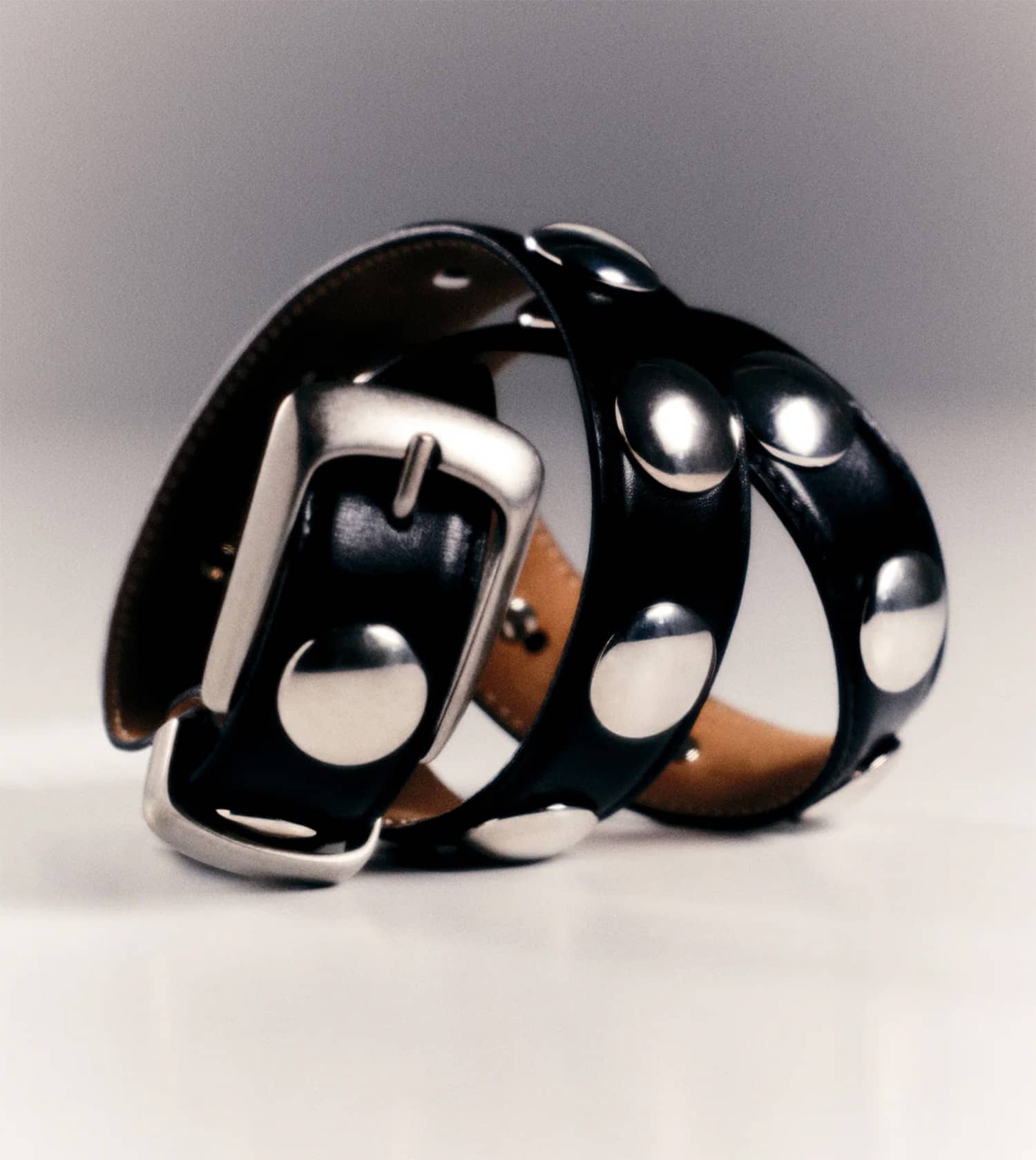 Khaite Benny Belt with Silver studs. Crafted in Italy of lustrous calfskin with tonal topstitching, it is accented with gleaming, jewelry-like hardware: polished silver-toned discs paired with a brushed buckle, loop, and tip.
