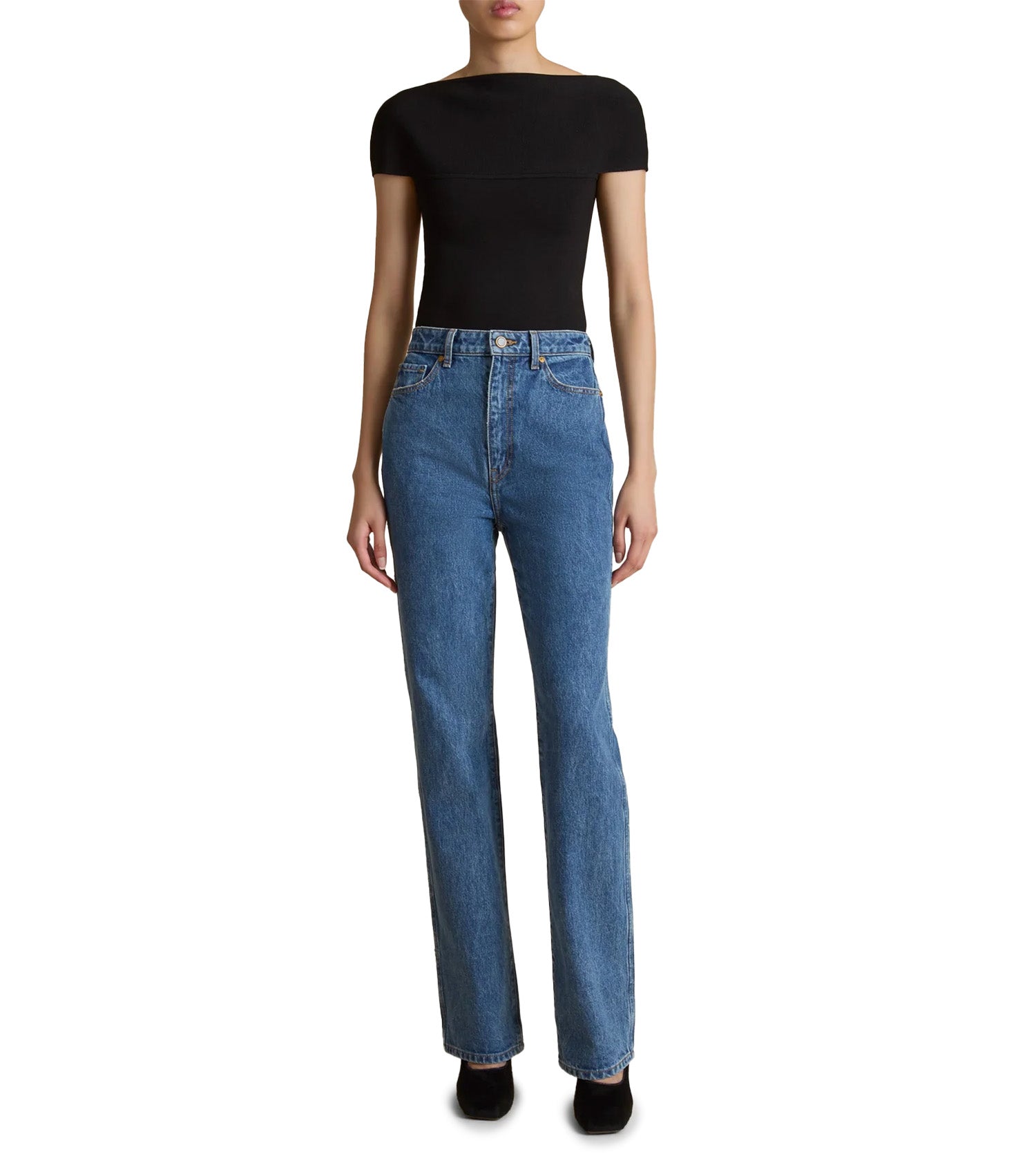 Khaite Danielle Jean Boone. Designed to visually elongate the legs, this high-rise style flatters with a stovepipe silhouette and marigold topstitching. Finished by hand.