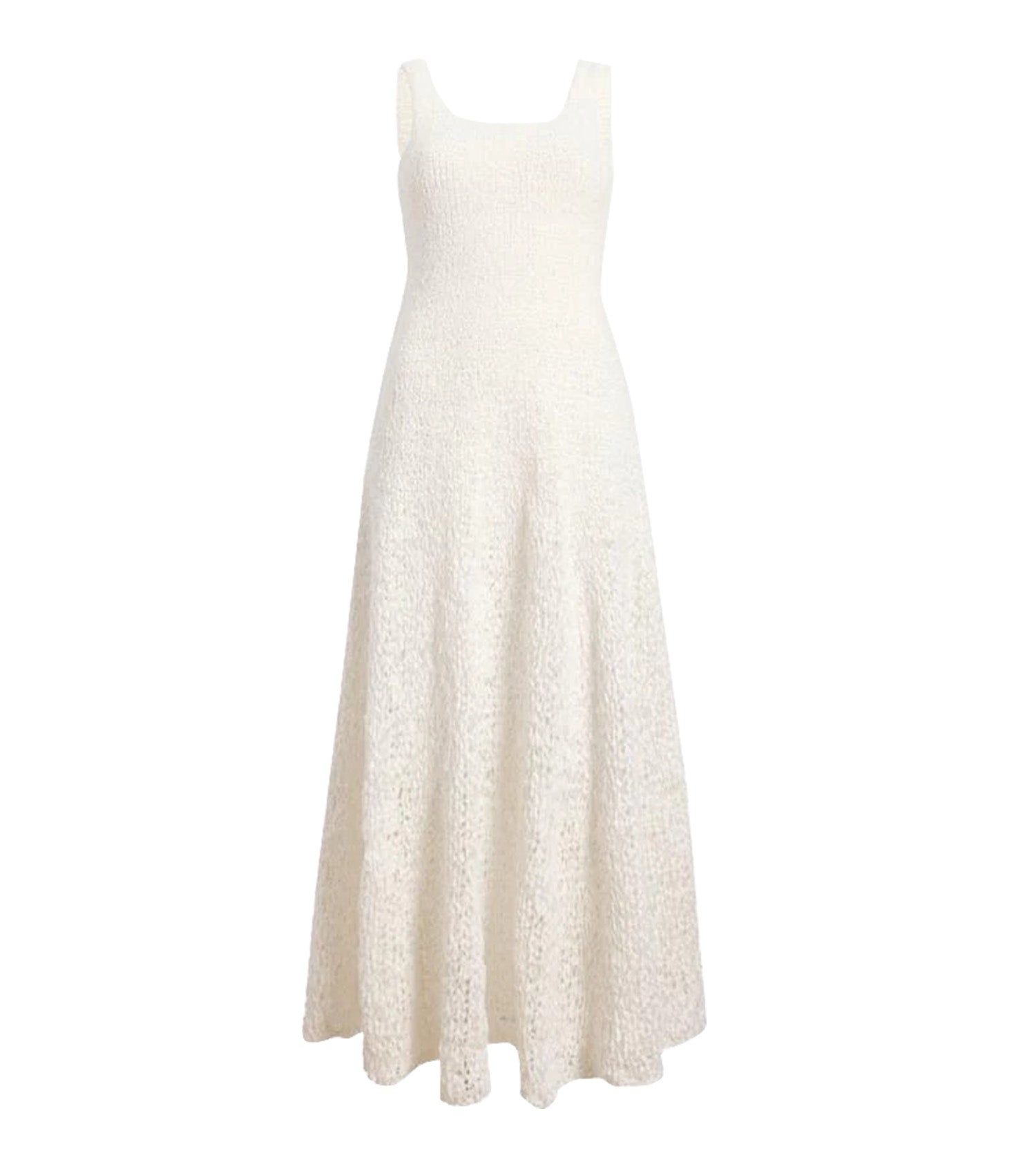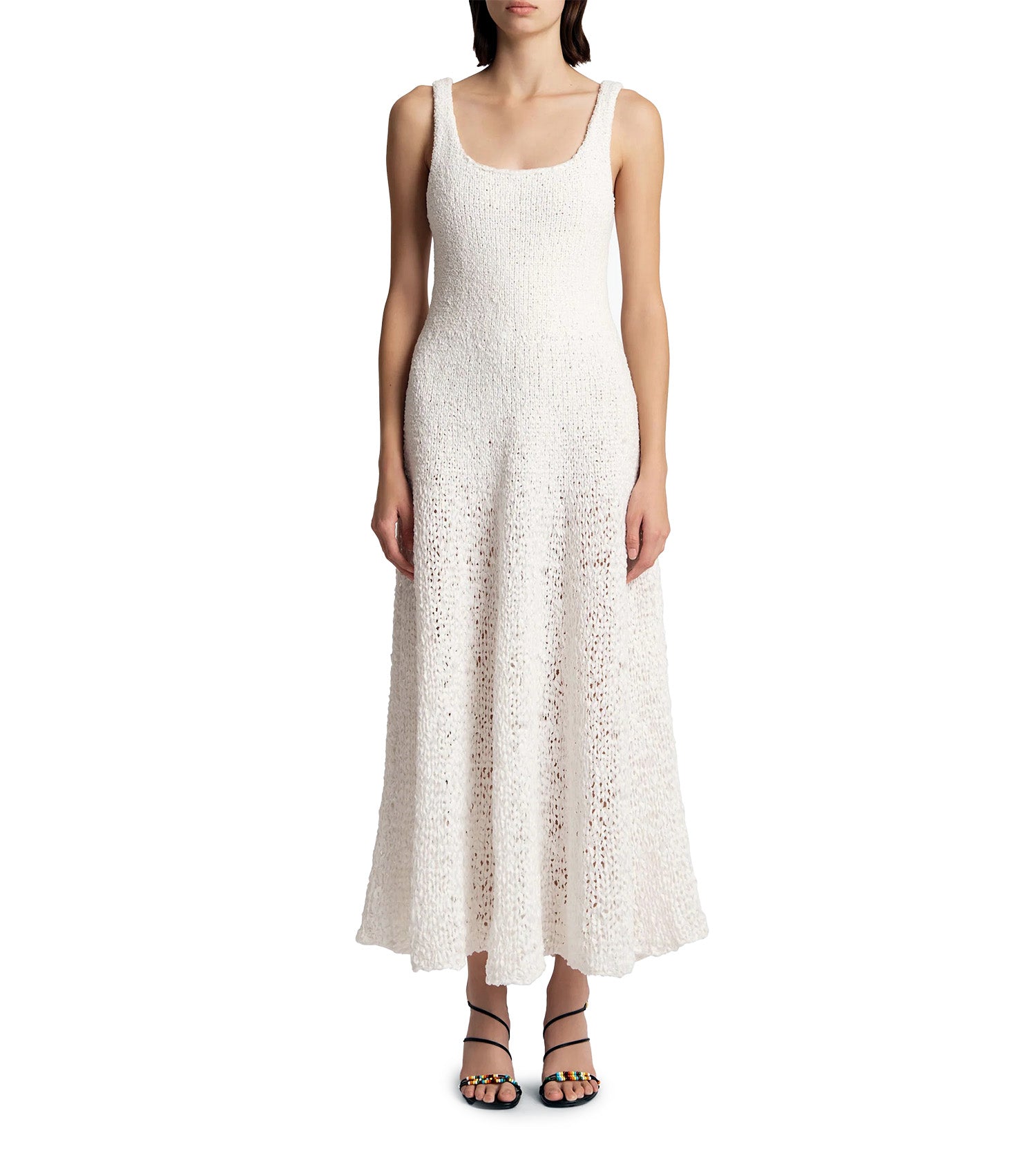 Khaite Twigs Dress. A hand-knit dress that gains structure and texture from cotton tape yarn. Shaped to accentuate the waist. Softly squared scoop neckline. Slips on.