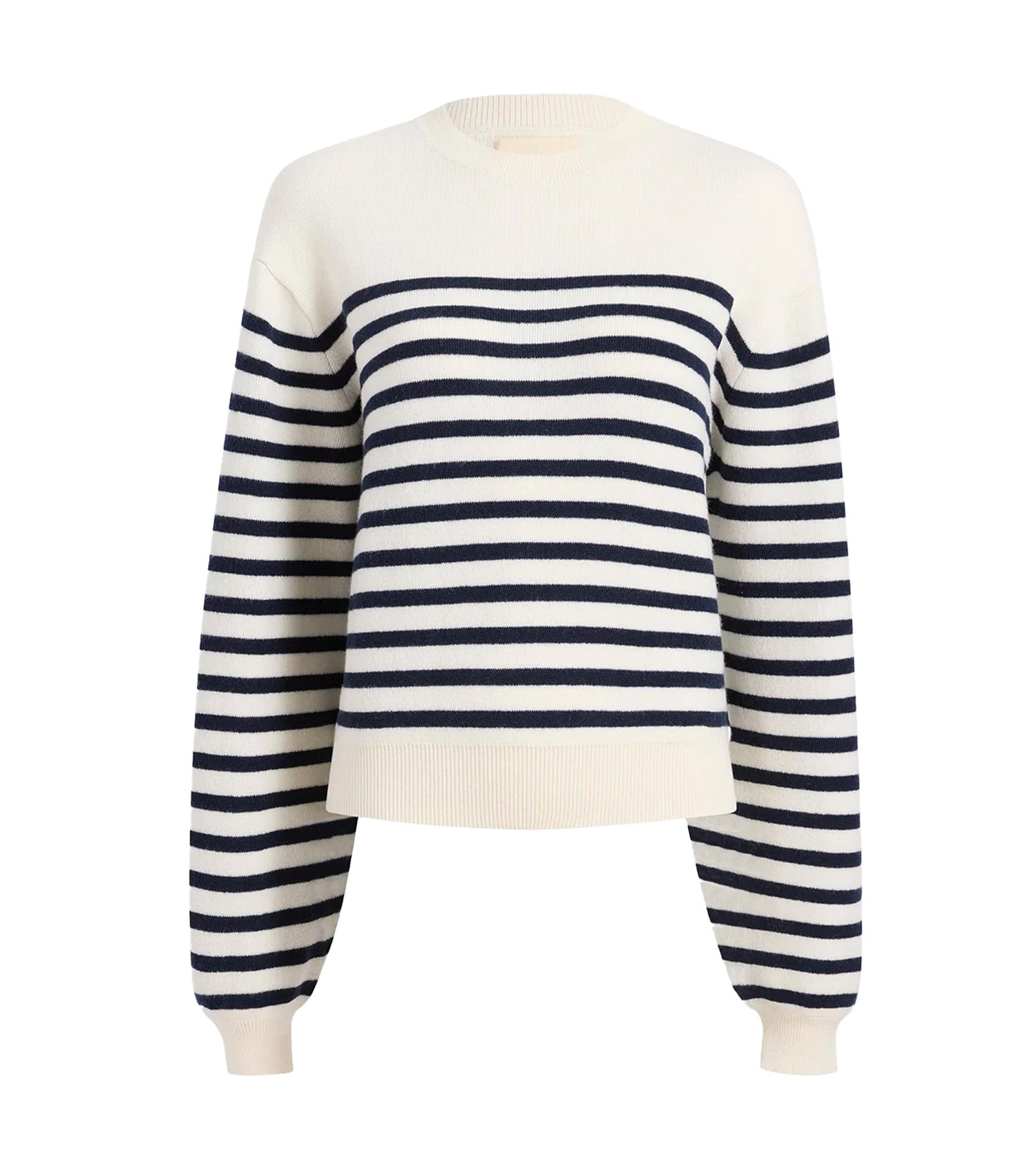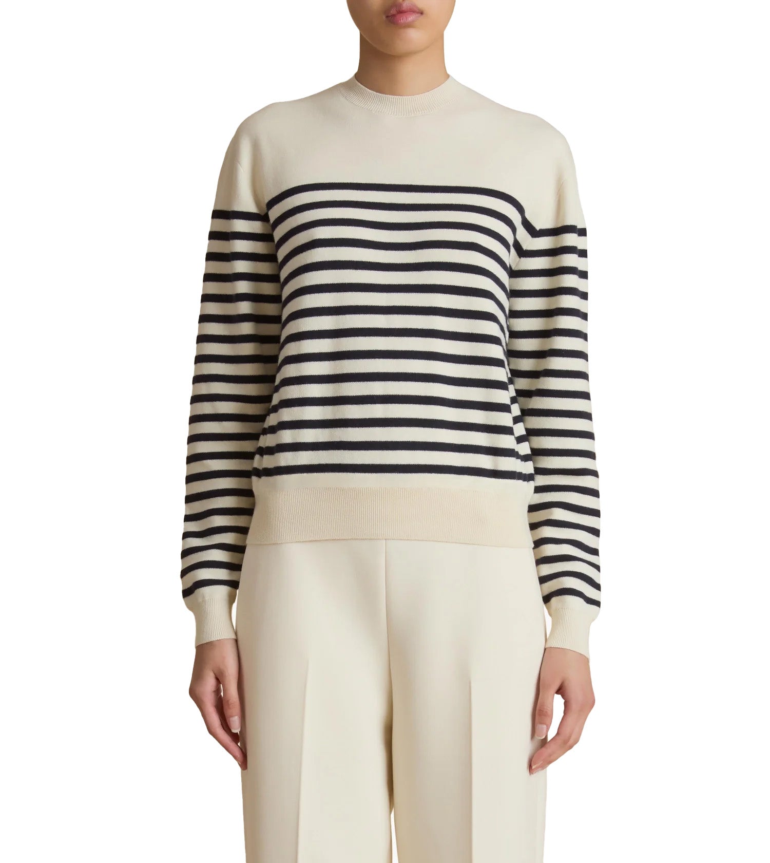 Khaite Viola Sweater Stripe Pattern. A mariner-striped pullover in especially fine cashmere. Relaxed by dropped shoulder seams. Ribbed trim at the crewneck, cuffs, and hem.