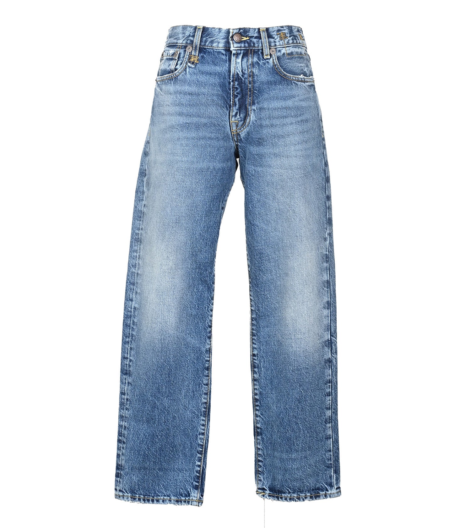 R13 Romeo Jean Hutton Blue. Slim variant on the classic boyfriend jean. Made of ridgid denim and washed in medium Indigo.