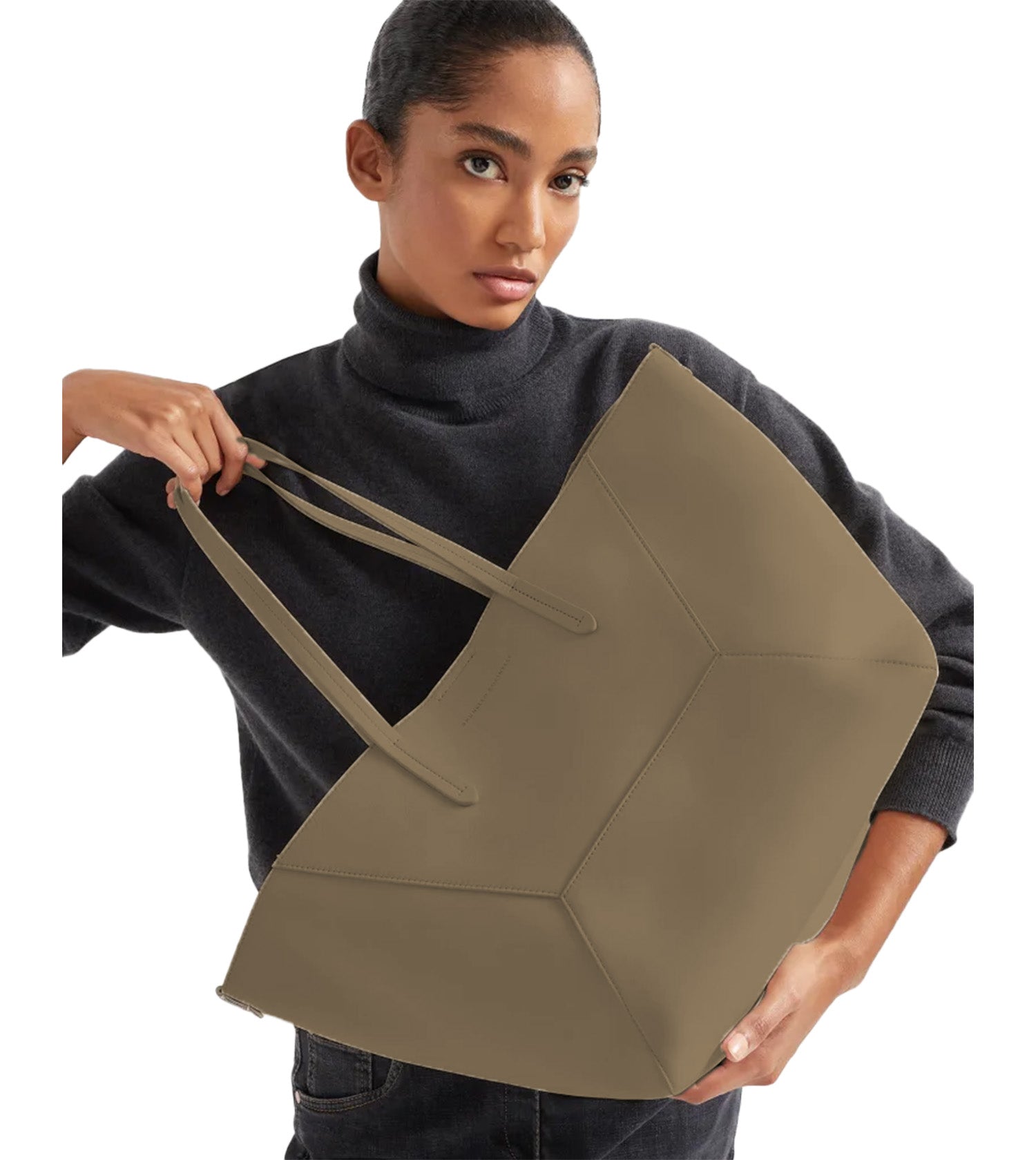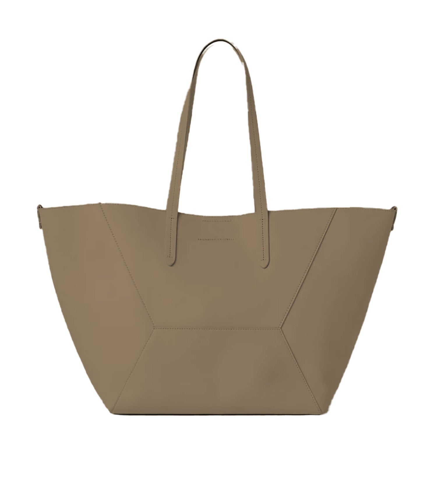 Brunello Cucinelli Leather large Tote Bag. The calfskin BC Duo bag reinterprets the classic "everyday bag" in true Brunello Cucinelli style. With an ultra-soft hand, the leather enhances the accessory’s contemporary feel, highlighted by bold stitching that emphasizes the squared, minimal lines.