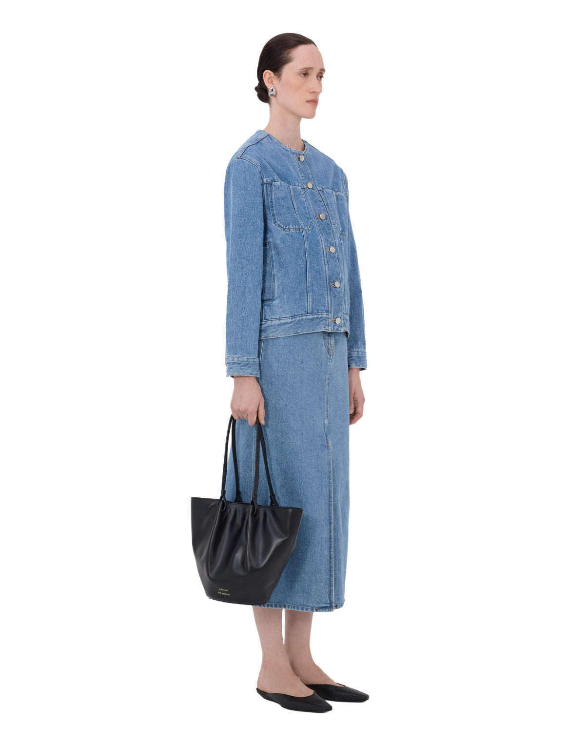 Light-wash collarless denim jacket with button front from LouLou de Saison.