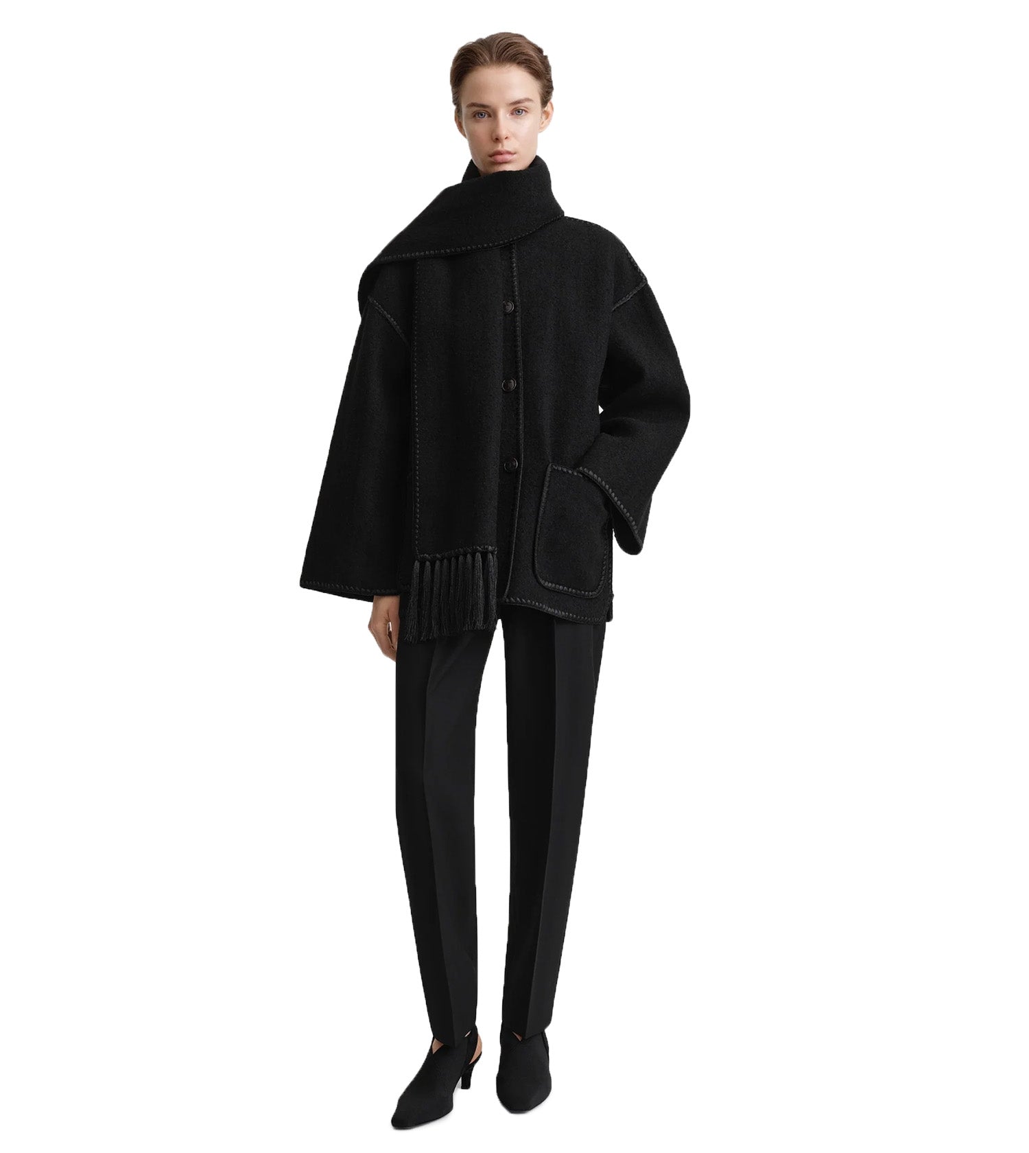 Toteme Embroidered Scarf Jacket. TOTEME coat jacket with an attached scarf that's embroidered along the edges for an artisanal finish. It’s made from heavy and structured wool-blend felt certified by the Responsible Wool Standard and designed for an oversized fit with dropped shoulders, wide sleeves with slits, and patch pockets.