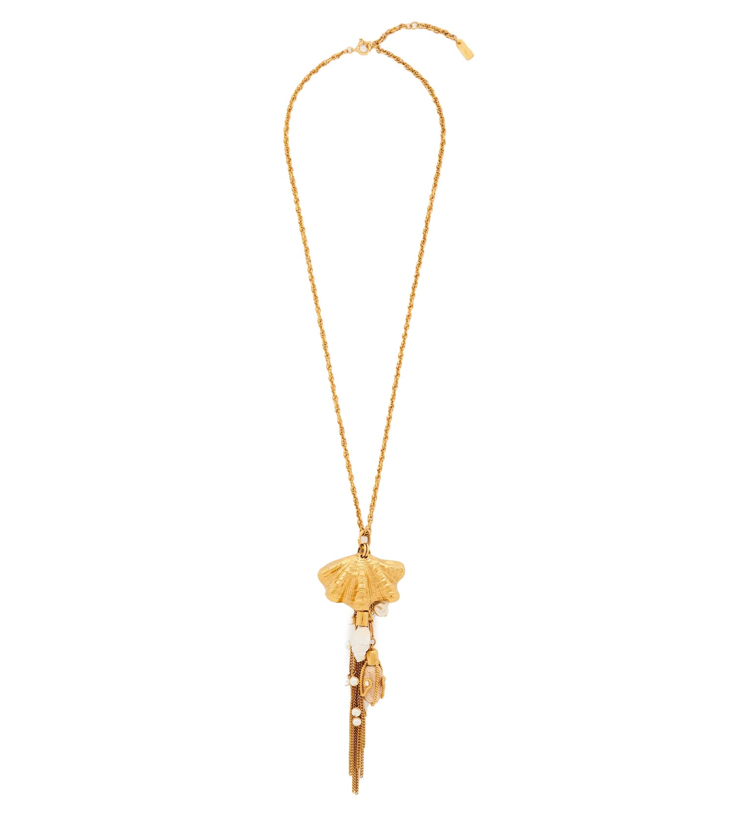 Chloe Pearl and Shell Necklace. Chloé Shells pendant necklace in vintage gold brass showcasing a variety of textures, including real shells. The long, adjustable chain is embellished with a large shell pendant and two smaller shells, dangling chains, and synthetic pearls. A Chloé logo plate finishes this piece.