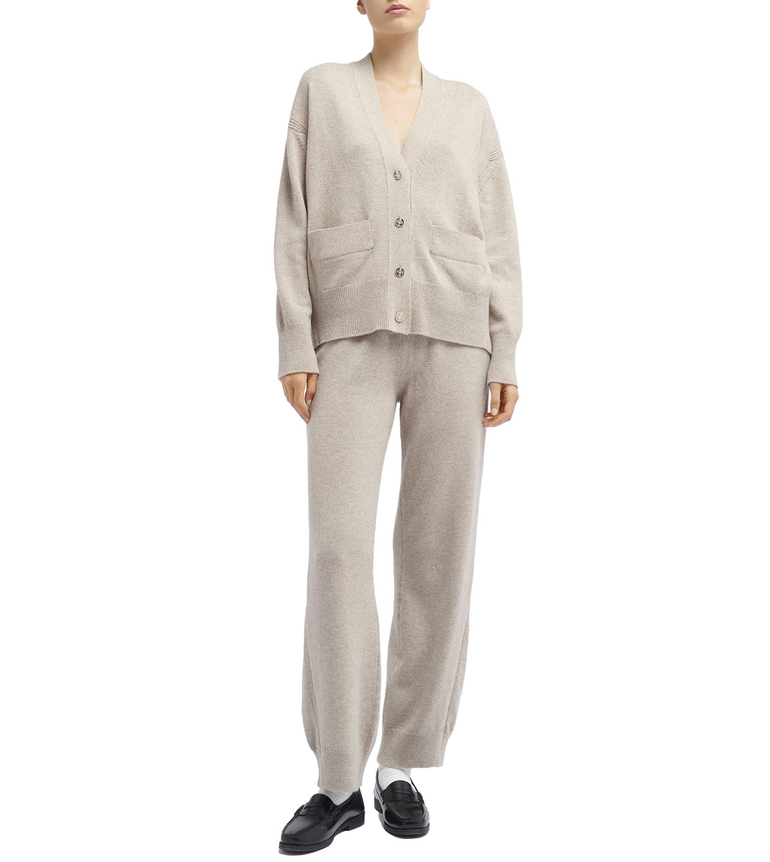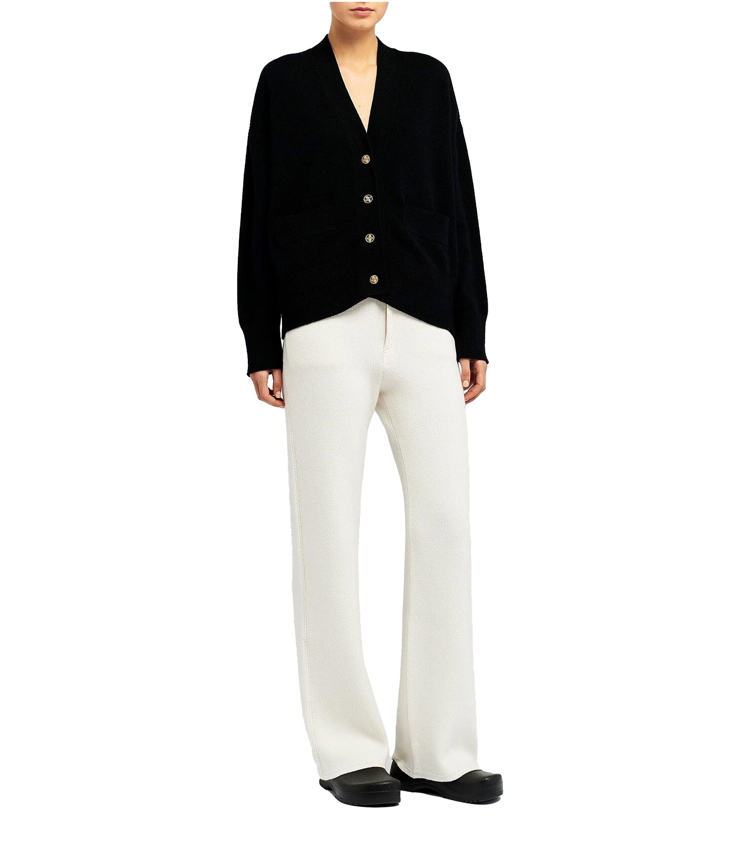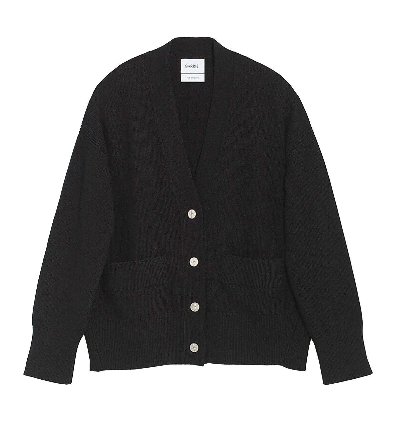 Barrie Long Sleeve Over Sized Cardigan 100% Cashmere. This simple-looking V-neck cardigan features ribbed knit detailing along the seams and is adorned with gold-tone metal Barrie logo buttons to create a comfortable yet stylish piece.