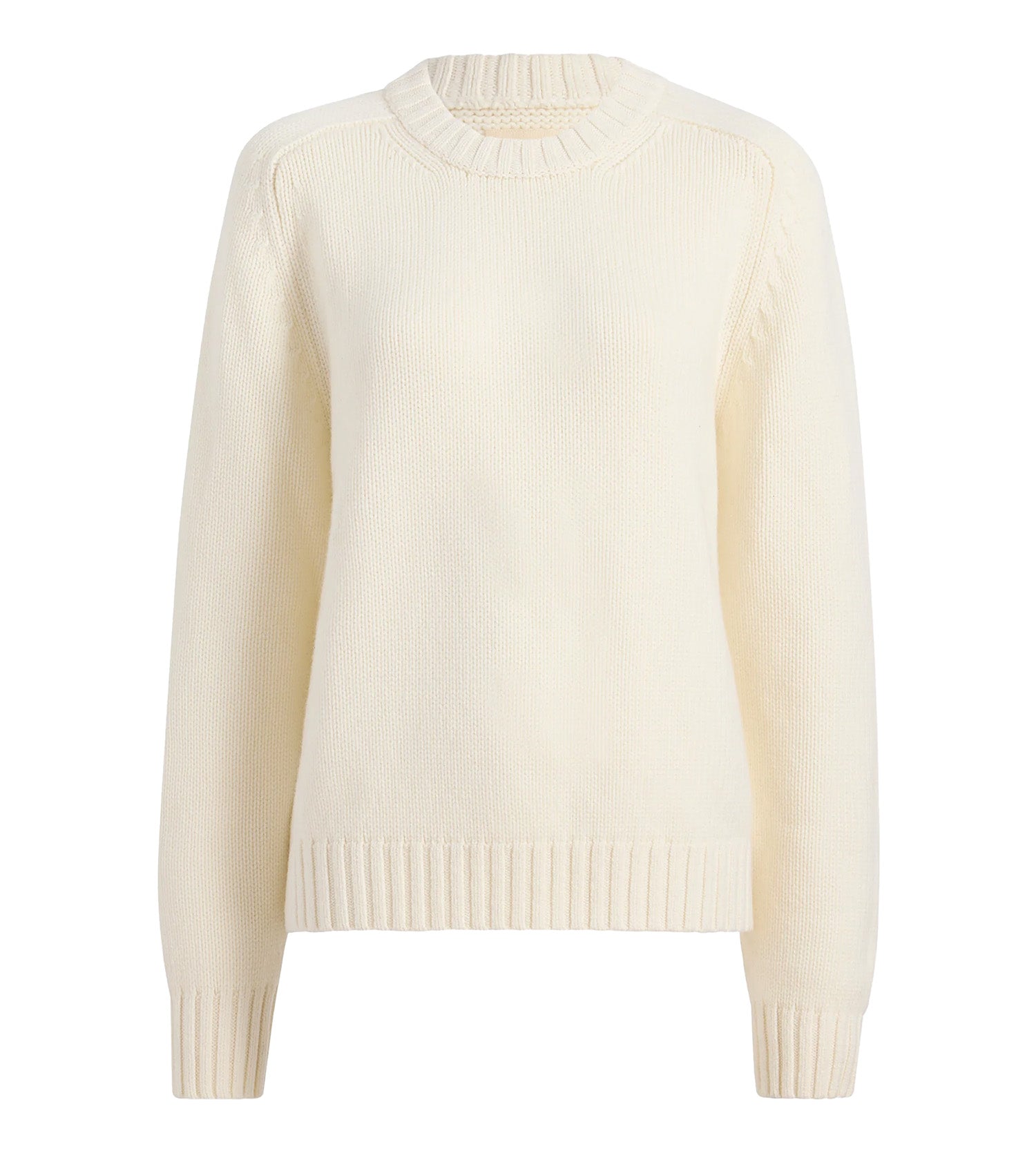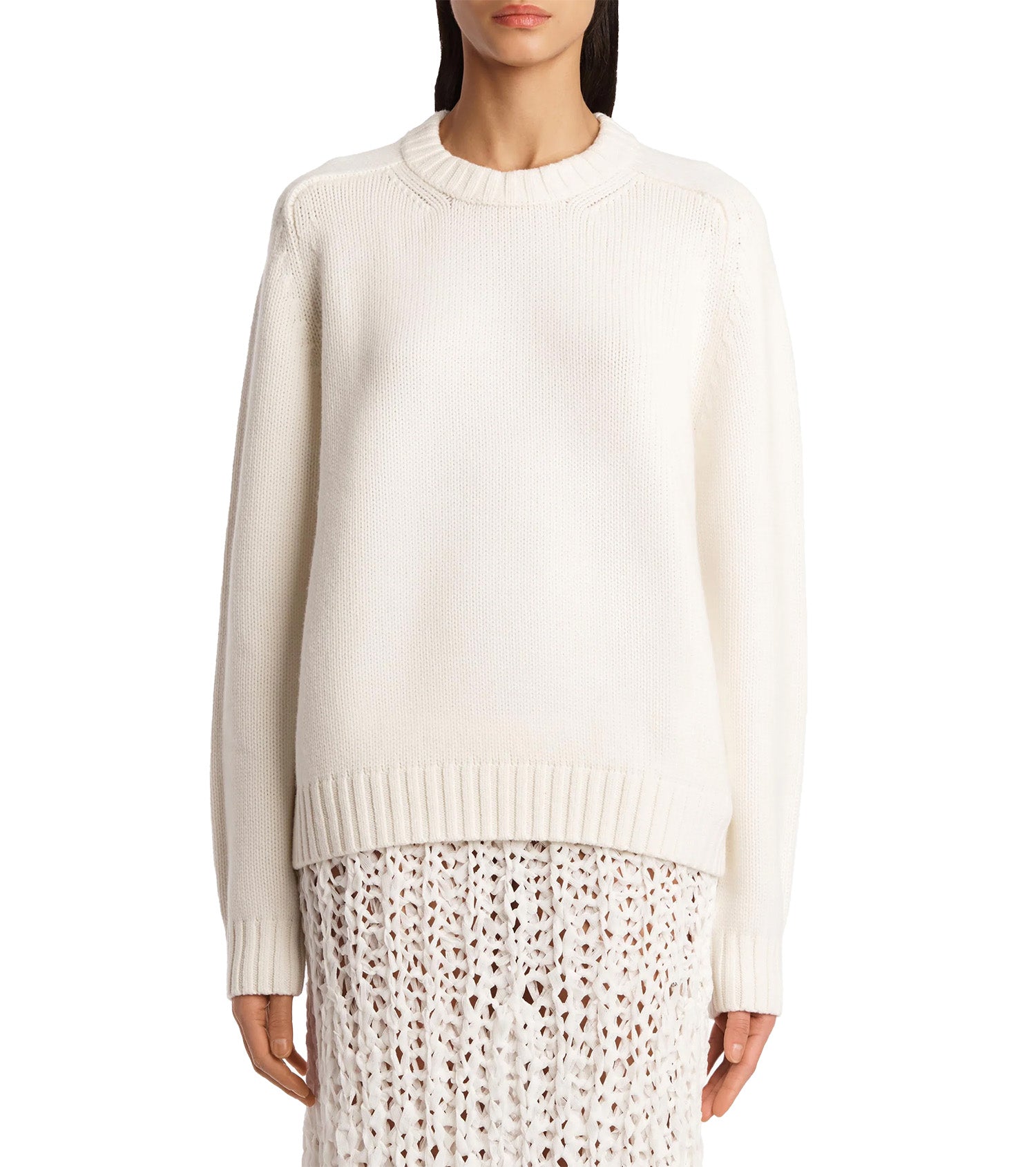Khaite Mae Sweater. An enveloping cashmere pullover with extended sleeves. The relaxed silhouette is refined by ribbed trim at the crewneck, hem, and cuffs.