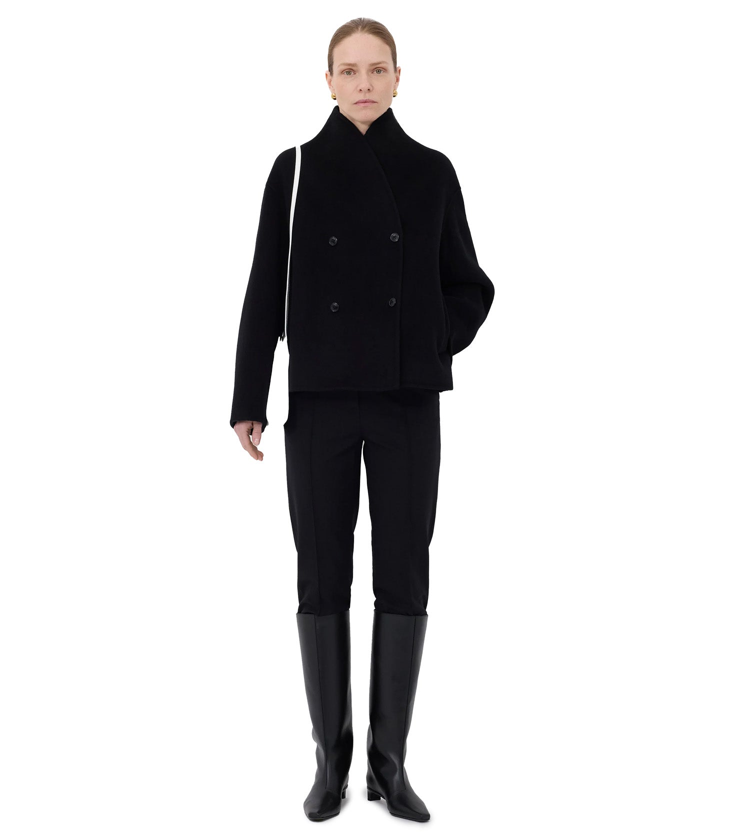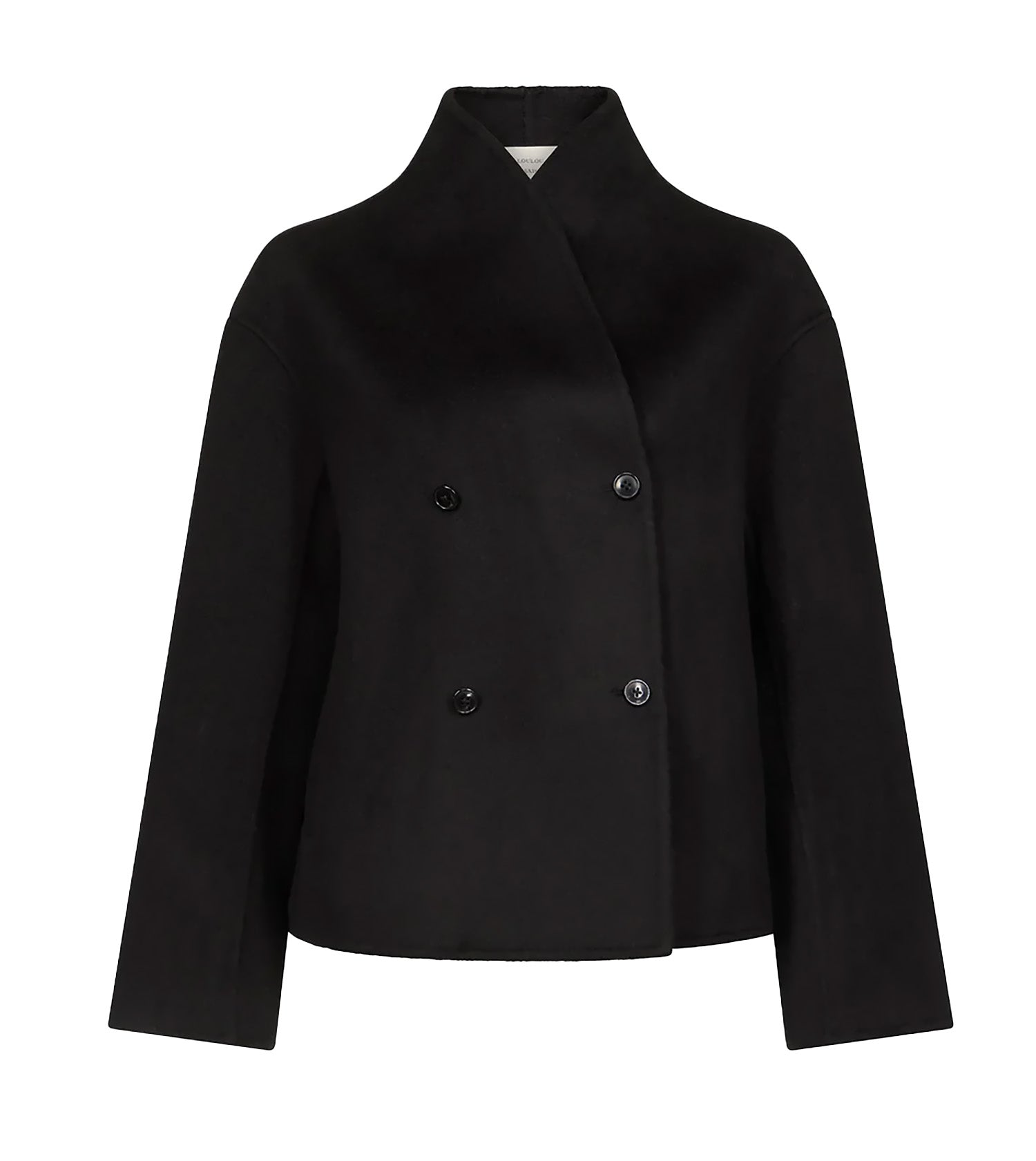 Loulou Studio Meyer Double Breasted Jacket. This jacket is made of a heavy wool cashmere drap with a soft touch. It features a straight fit and a double breasted opening. Its V neckline wraps delicately around the neck, creating a warm, enveloping look. Structured an assertive, it stands as a commanding transeasonal and winter piece.