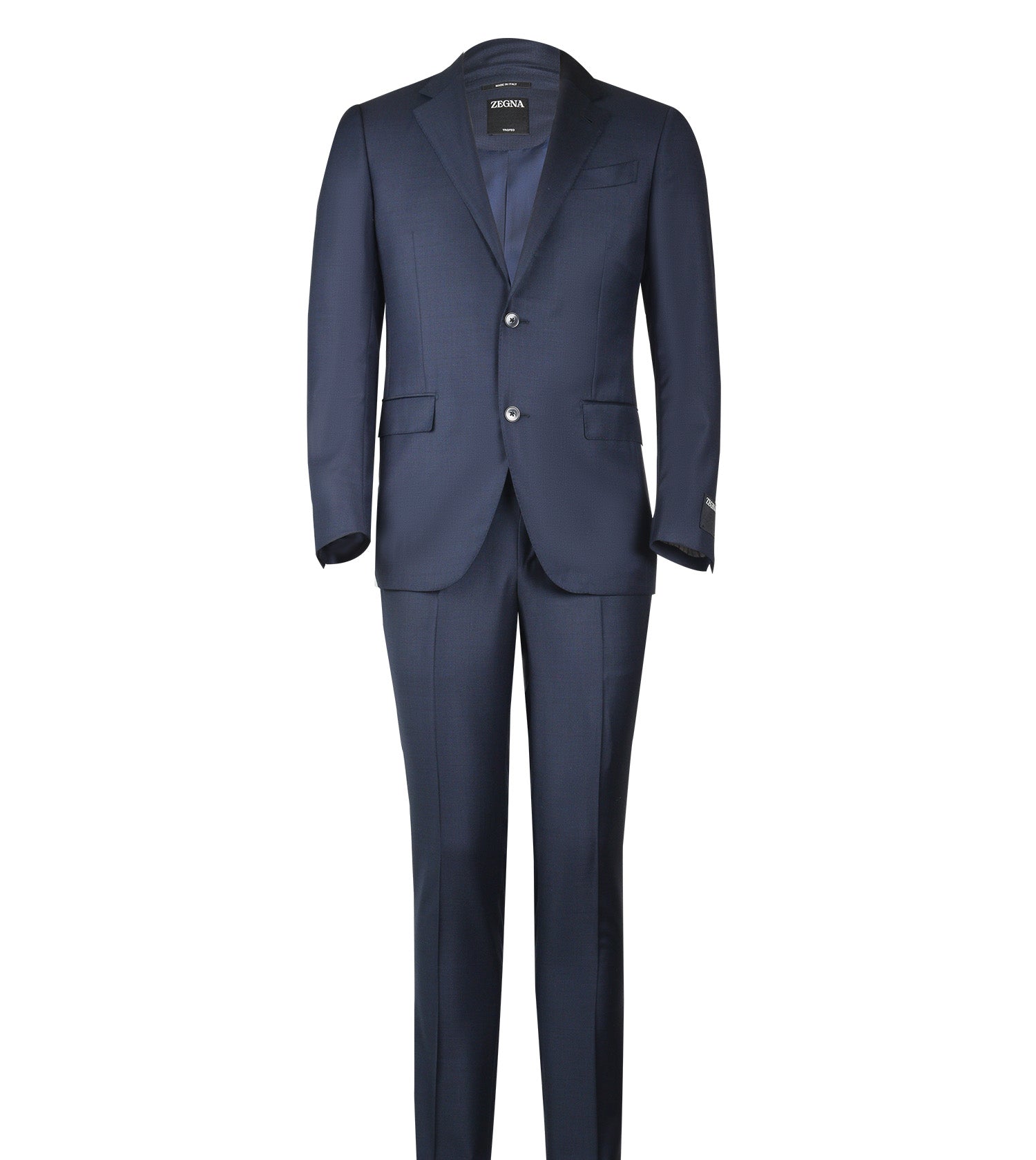 ZEGNA Navy Trofeo Ticweave Suit. Elegant details. Double vented back, notched lapels, chest welt pocket finishing with besom pockets.